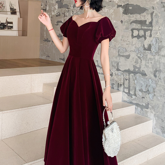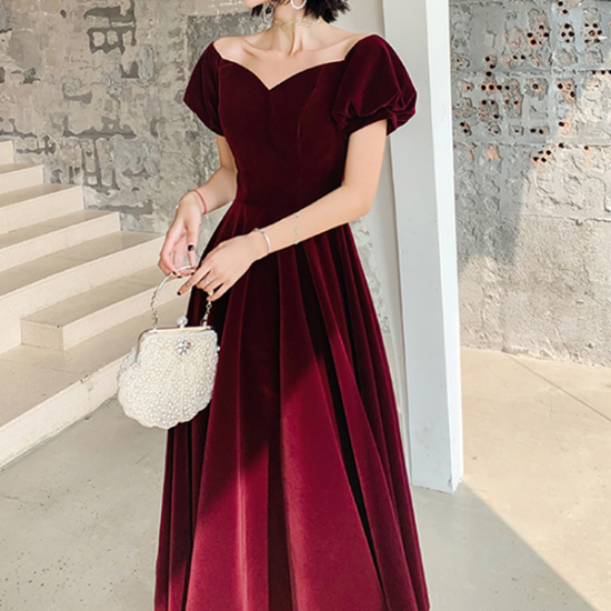 ドレス 高級感 ベルベット 大人色 ミディ丈 ロング丈 Aライン ハートネック パフスリーブ クラシカル ロングフレア 端正 秋冬 結婚式 二次会 お呼ばれ