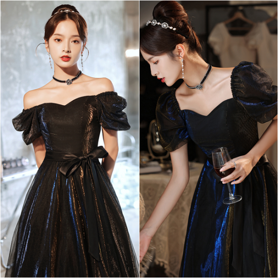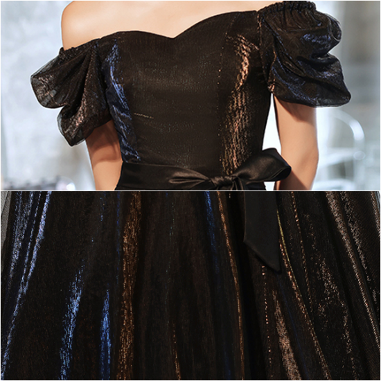 ドレス オーロラ 煌めき パフスリーブ Aライン ハートネック ウエストリボン 女らしさ オフショルダー 大人っぽ フォーマル 結婚式 二次会 お呼ばれ