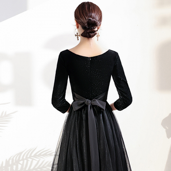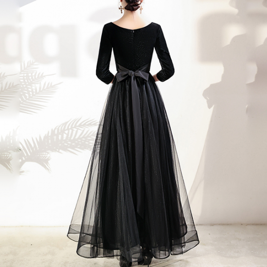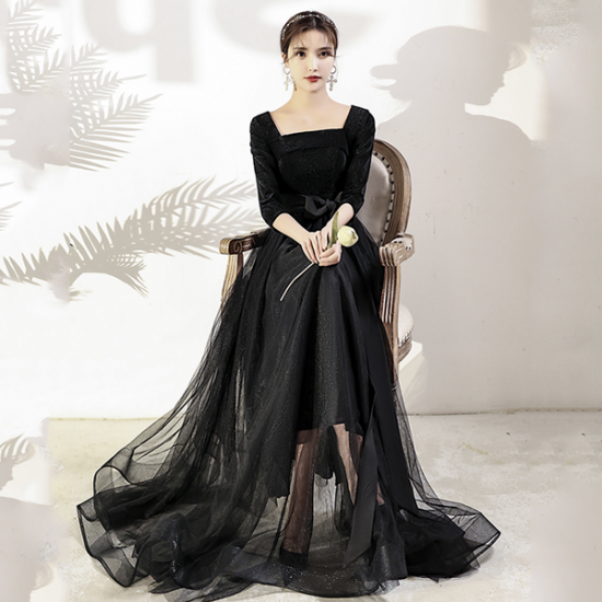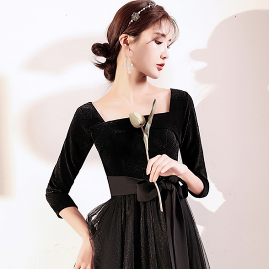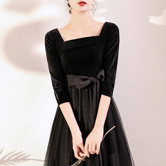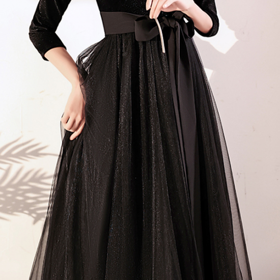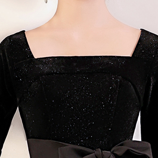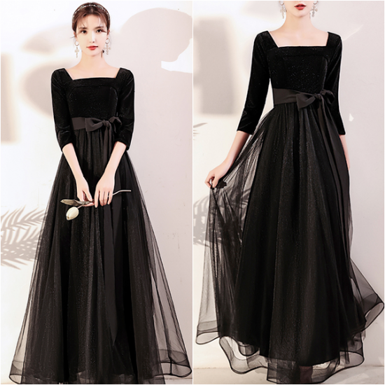 ドレス クラシカル ベルベット 綺麗 透け感 チュール 秋冬 スクエアネック ロング丈 ウエストリボン レディ 結婚式 二次会 お呼ばれ