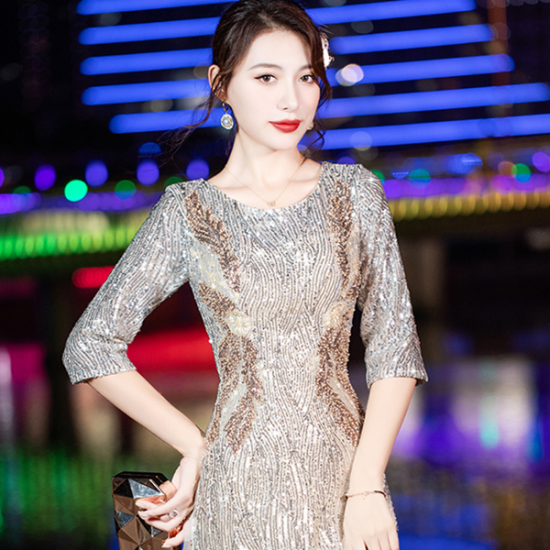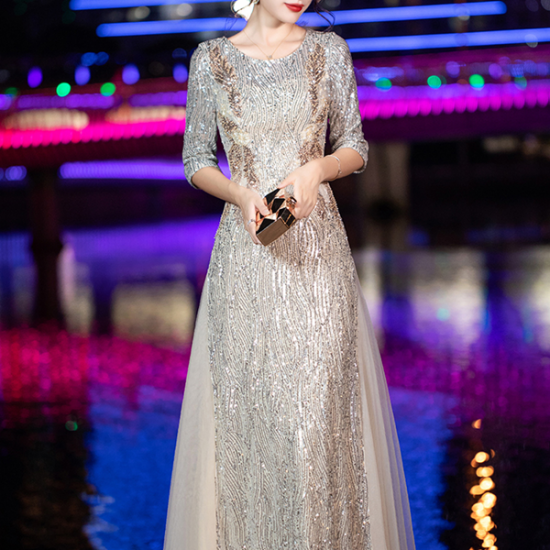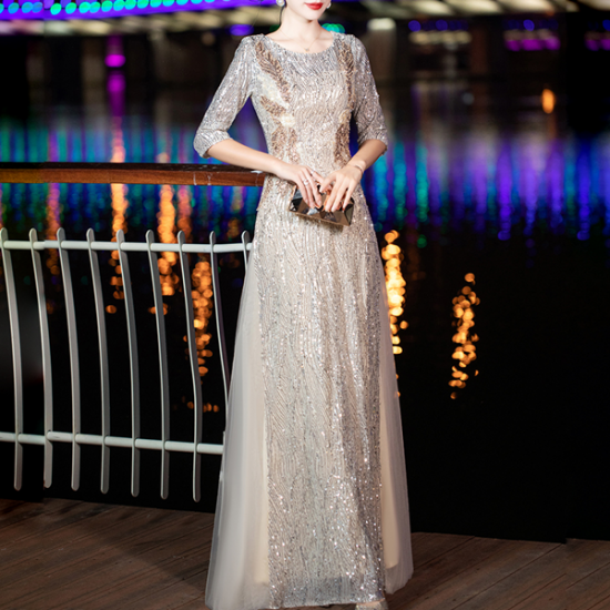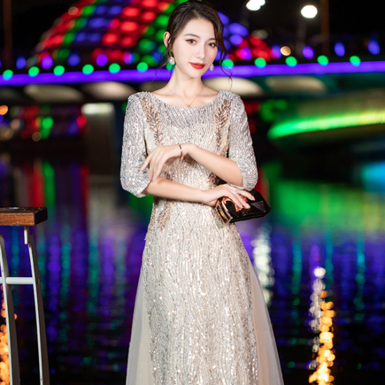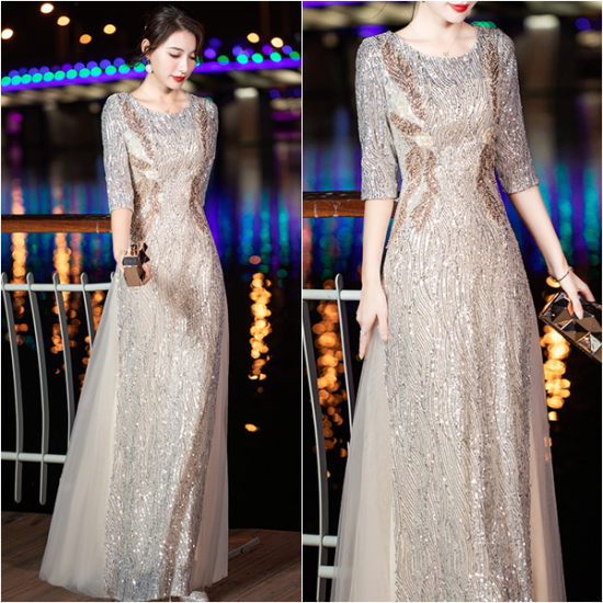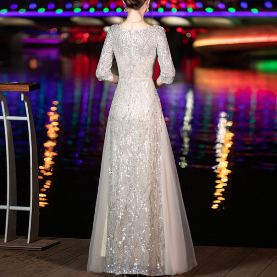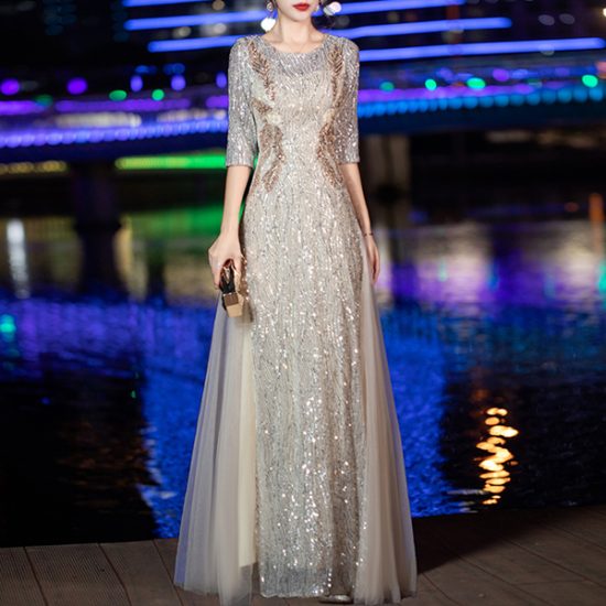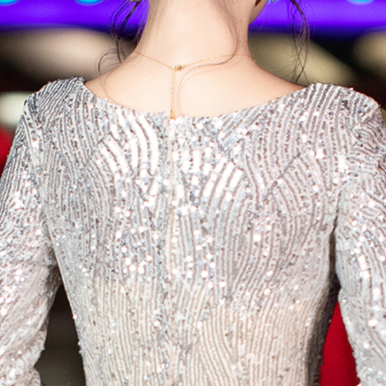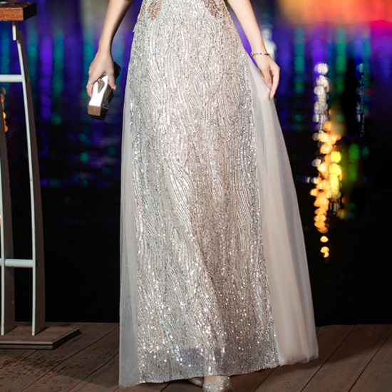 ドレス 手仕事感 総スパンコール ロングチュール 女性らしさ 縦ライン すらり見え リュクス 輝き 特別 結婚式 二次会 お呼ばれ