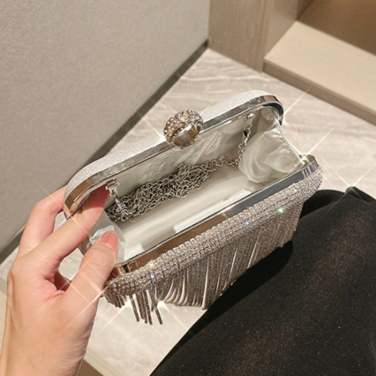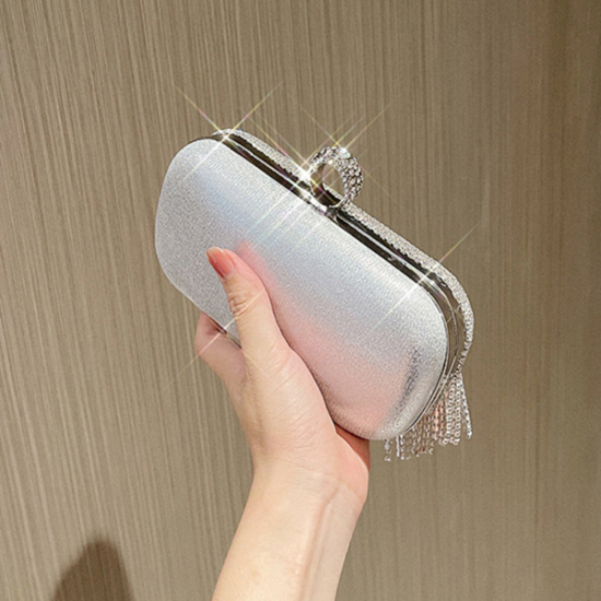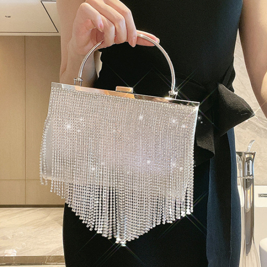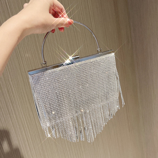 パーティーバッグ 揺れる ラインストーン タッセル 美しい クラッチバッグ 角丸リング アクセサリー感覚 小ぶり スクエア 大きめ 頼れるサイズ パーティー 結婚式 二次会 お呼ばれ