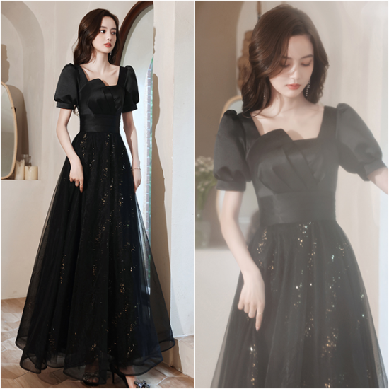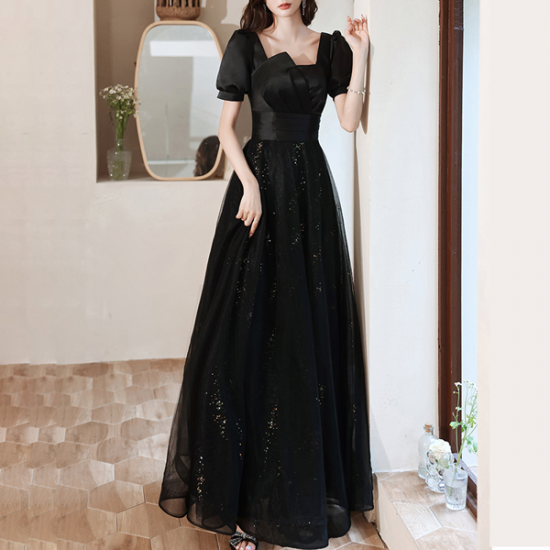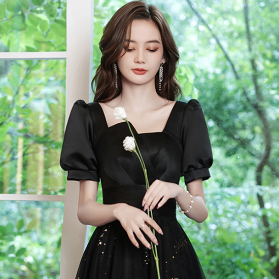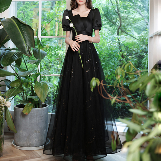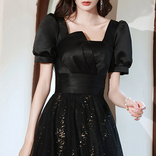 ドレス サテン 艶感 シアー オーガンジー スクエアカラー ランタンスリーブ クラシカル 格上げ フォーマル 端正 結婚式 二次会 お呼ばれ