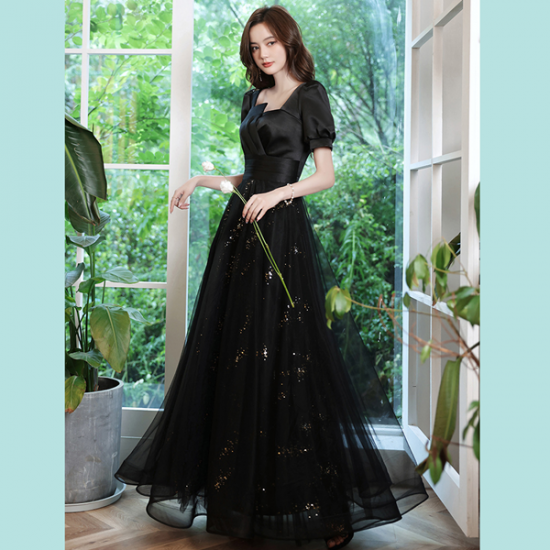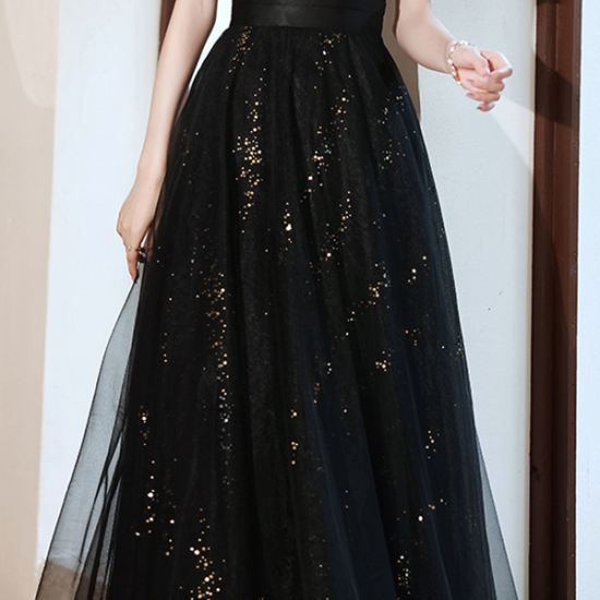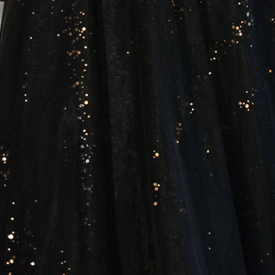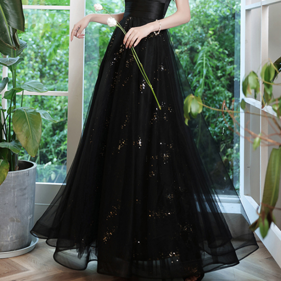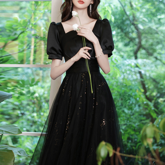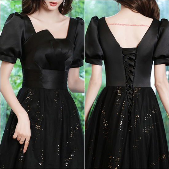 サテンの艶感とシアーなオーガンジーで魅せるブラックドレス。