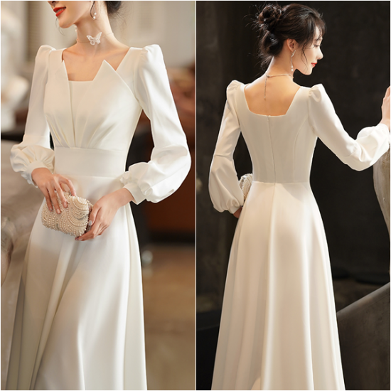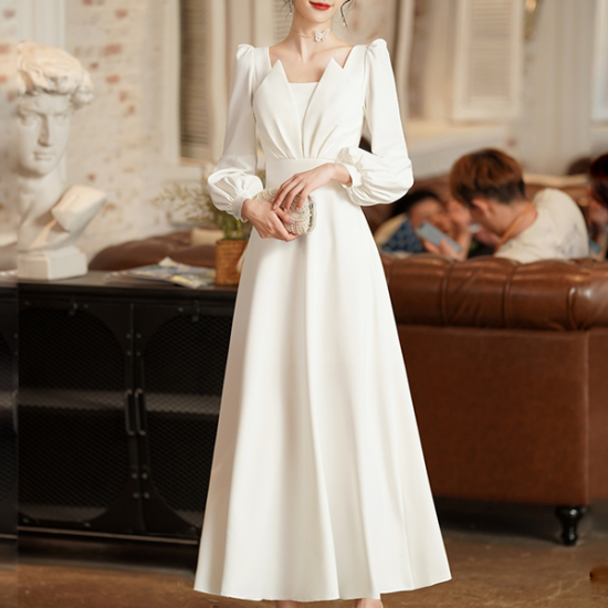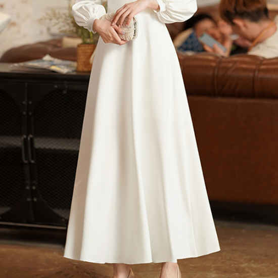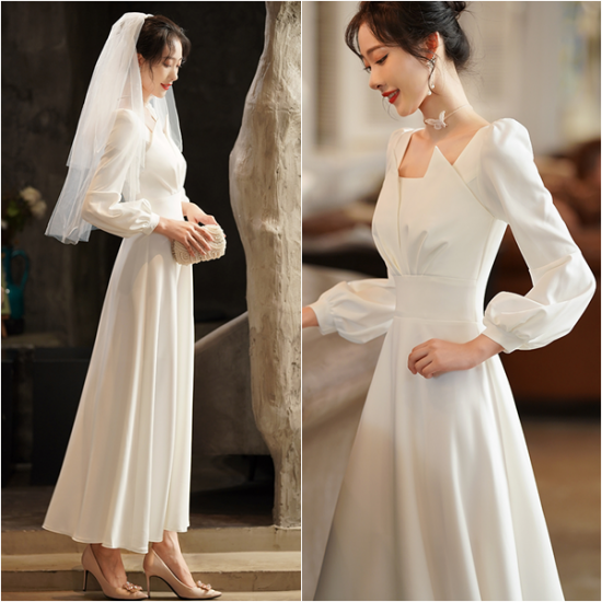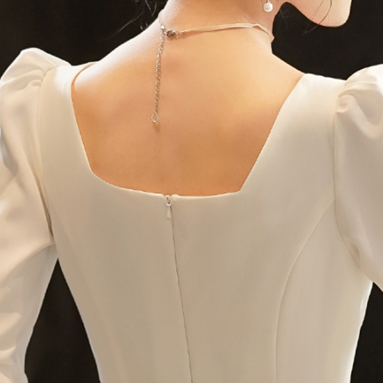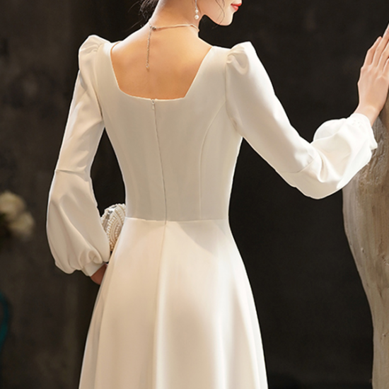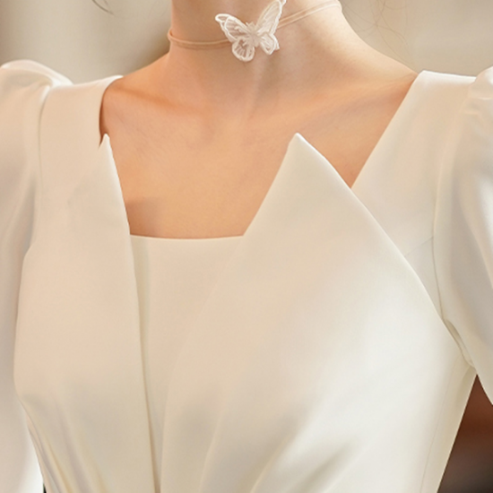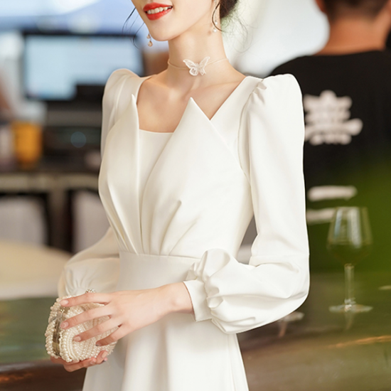ドレス 純白 サテン 立体的 ネックライン ランタンスリーブ ウエストシェイプ レディ 軽やか 丈感 洗練 結婚式 二次会 お呼ばれ