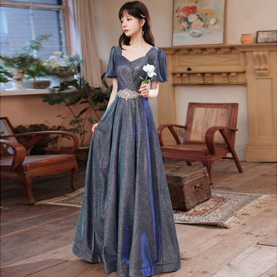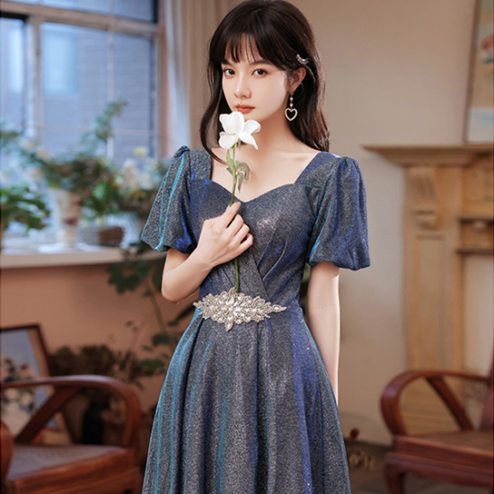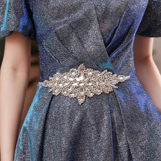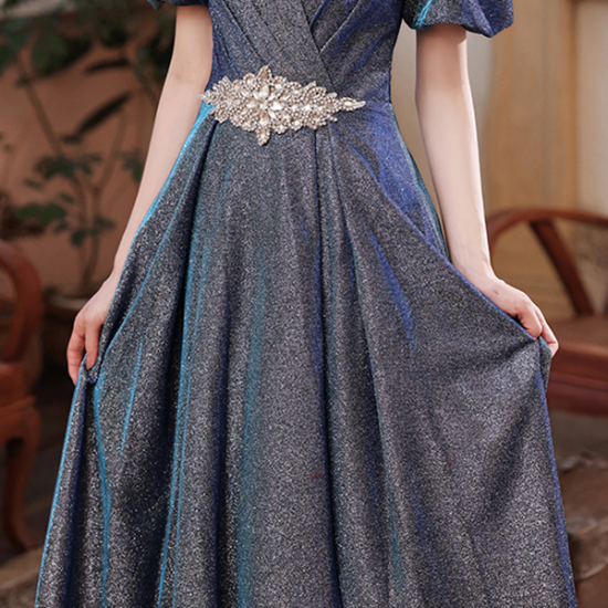 ドレス シルバーラメ 銀河 瞬き シック ネイビー ウエストビジュー 注目 ゆるやかフレア 女性らしい 結婚式 二次会 お呼ばれ