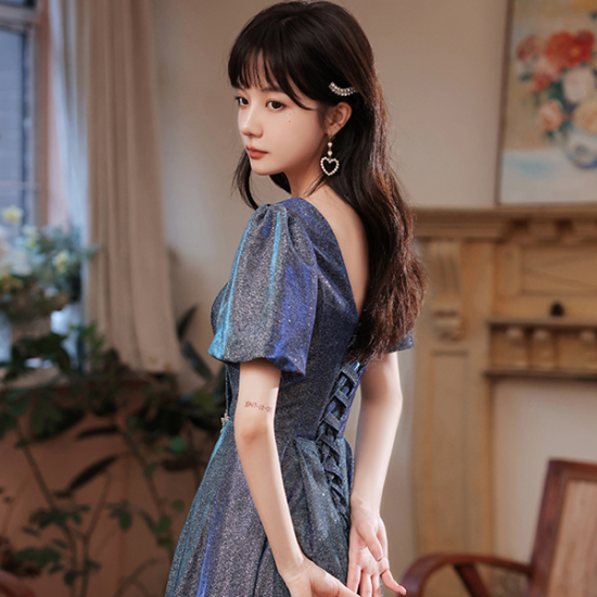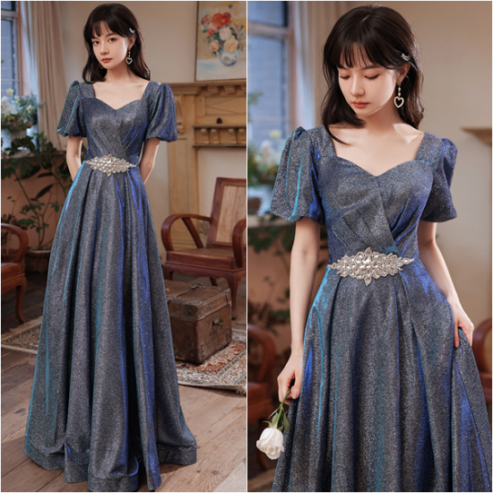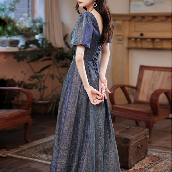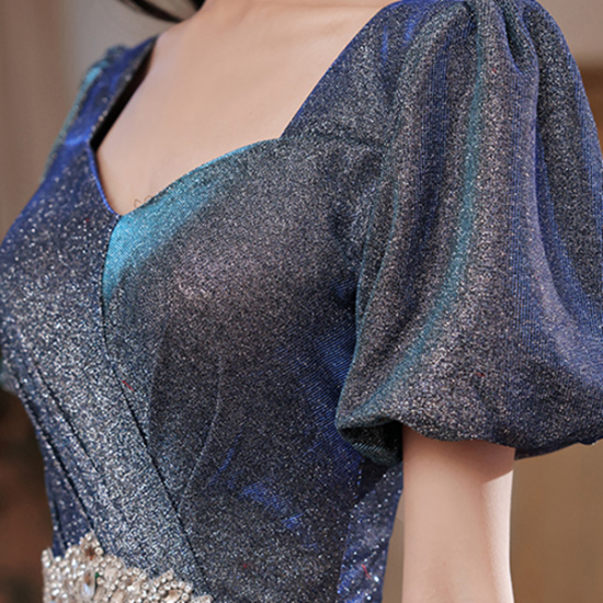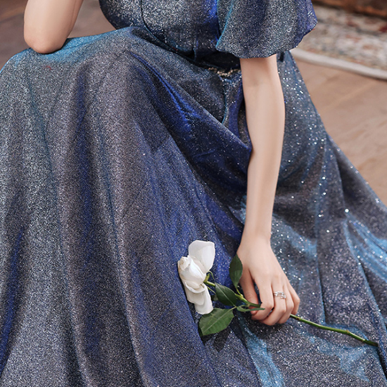 シルバーラメが銀河のように瞬く、シックなネイビーのロングドレス。