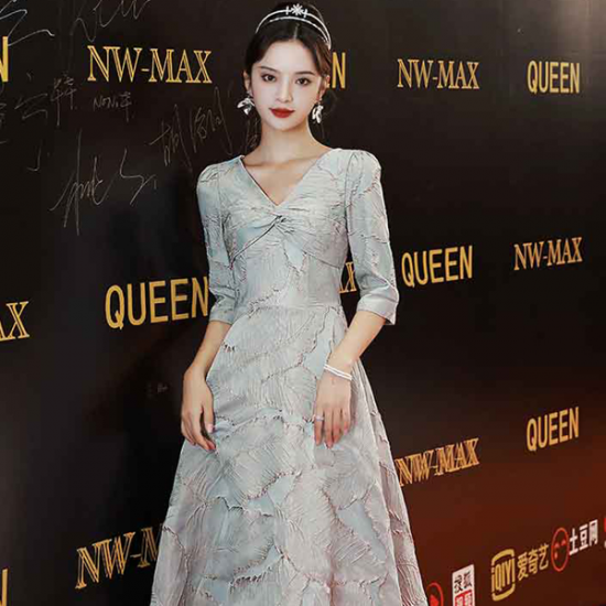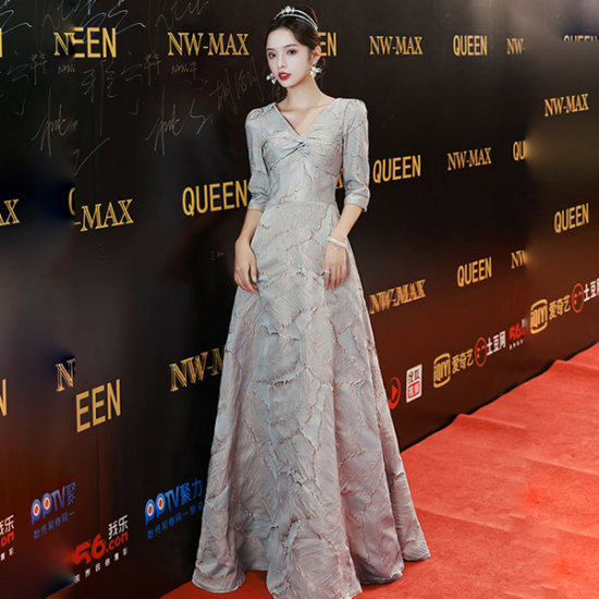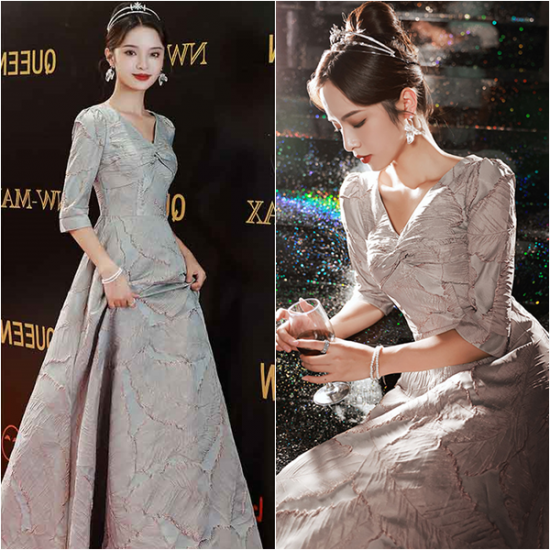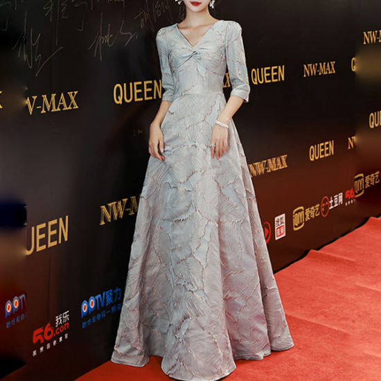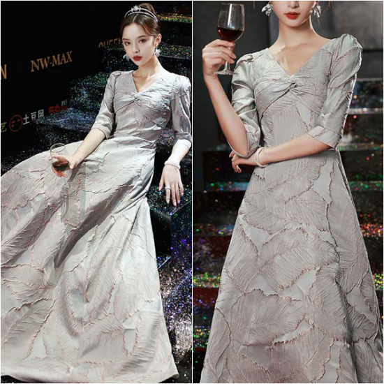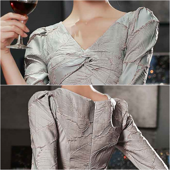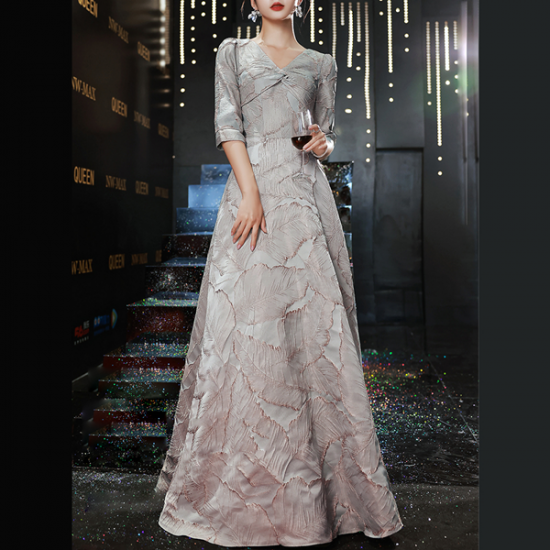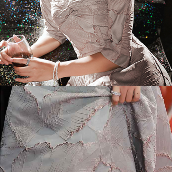 凹凸感のあるフェザー模様が煌めく、スタイリッシュな5分袖ロングドレス。