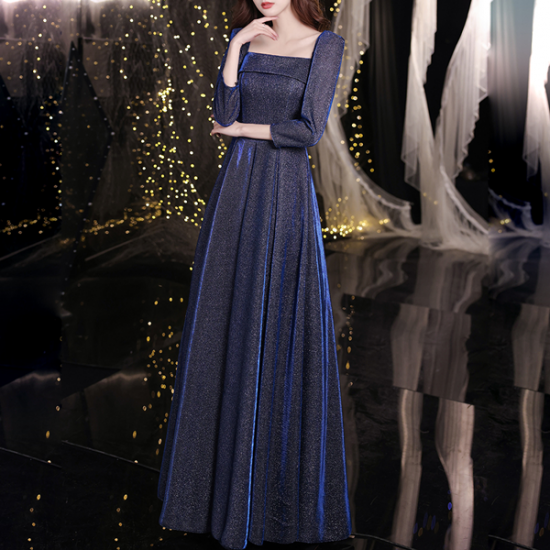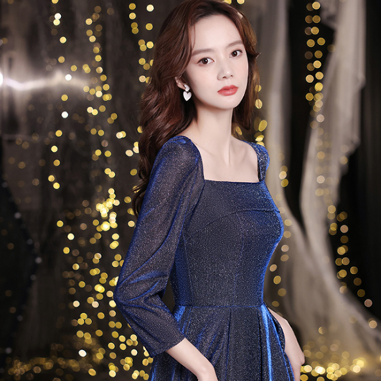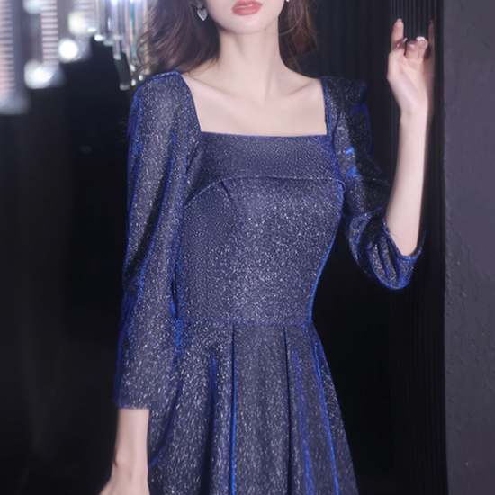 ドレス ブルー 星屑 凛とした Aライン スクエアカラー 7分袖 好印象 端正 タック ノーブル 結婚式 二次会 お呼ばれ