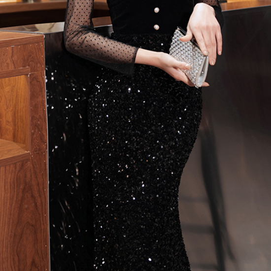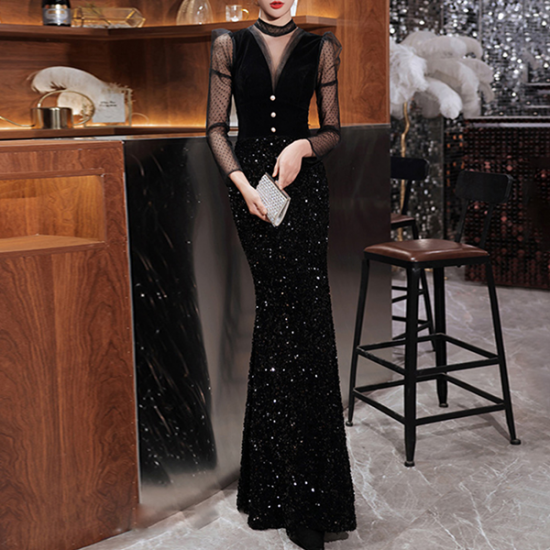 ドレス スパンコール 煌めき セクシー 透け感 マーメイド ロング&リーン 大人女性 クラスアップ パールボタン 上品 モード 結婚式 二次会 お呼ばれ