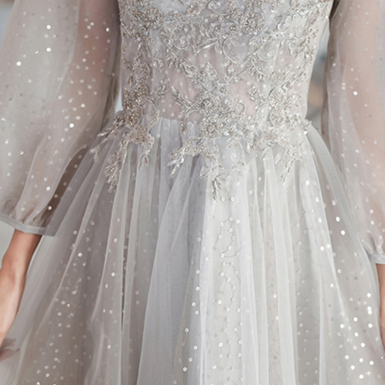 豪華なフラワー刺繍と、煌めきをまとったオーガンジーのロングドレス。