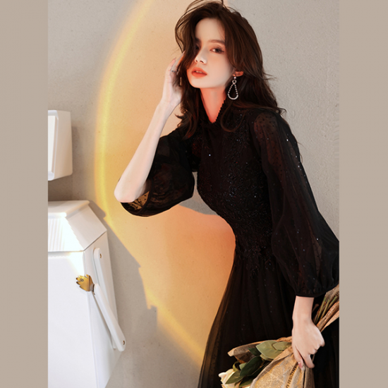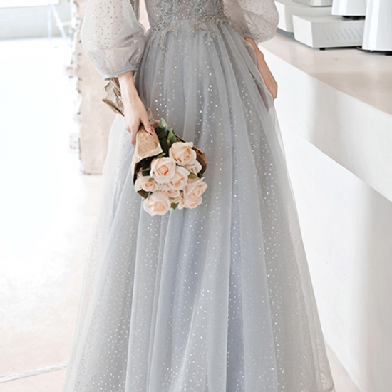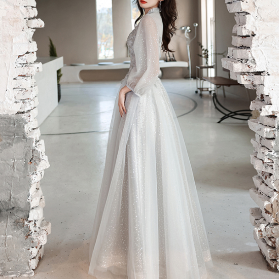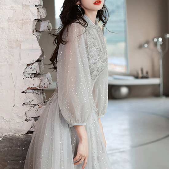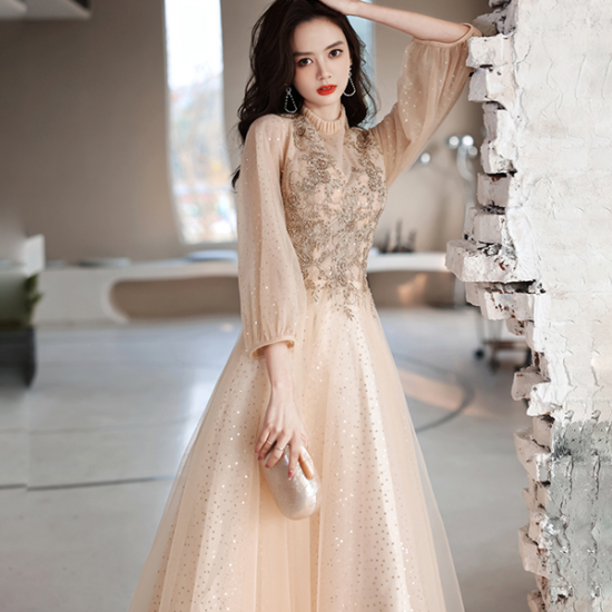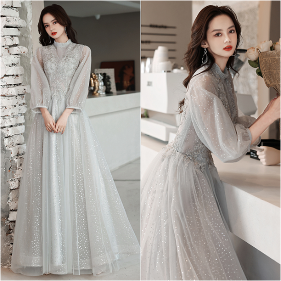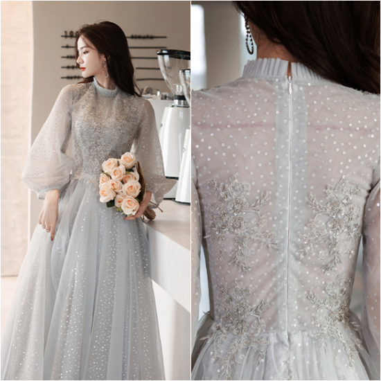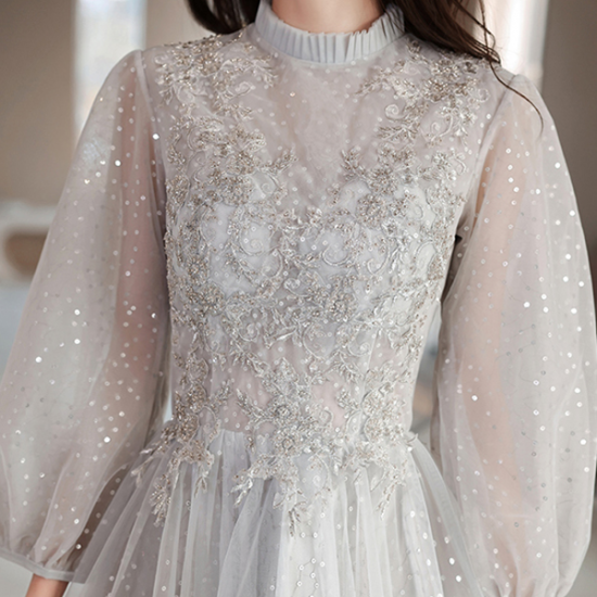 ドレス 豪華 フラワー刺繍 煌めき オーガンジー ロング ふんわり袖 プリーツ スタンドカラー 優雅 柔らか 格式 結婚式 二次会 お呼ばれ