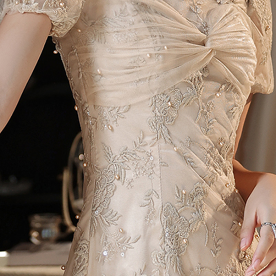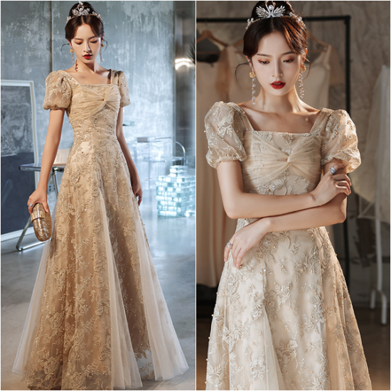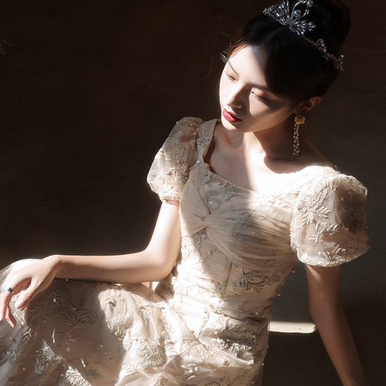 ドレス 上質 フラワー刺繍 パールビーズ 前後スクエアネック パフスリーブ クラシカル 上品リッチ ニュアンスカラー 結婚式 二次会 お呼ばれ
