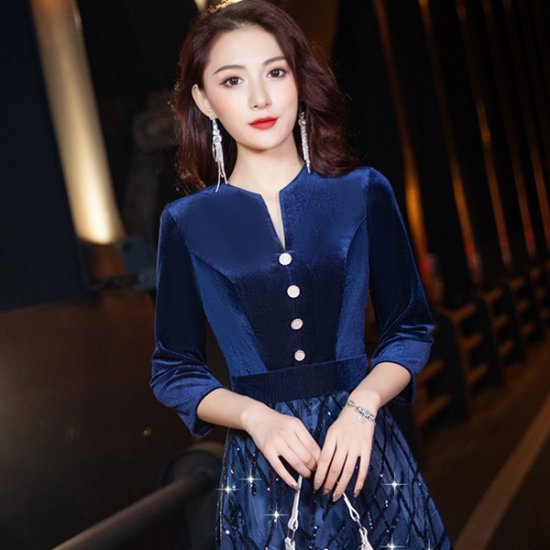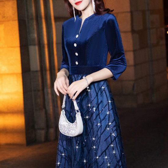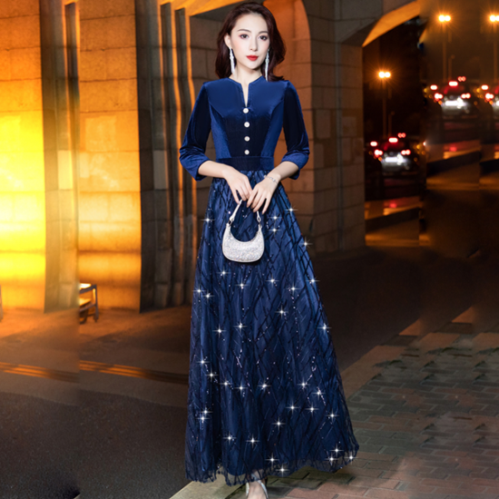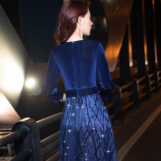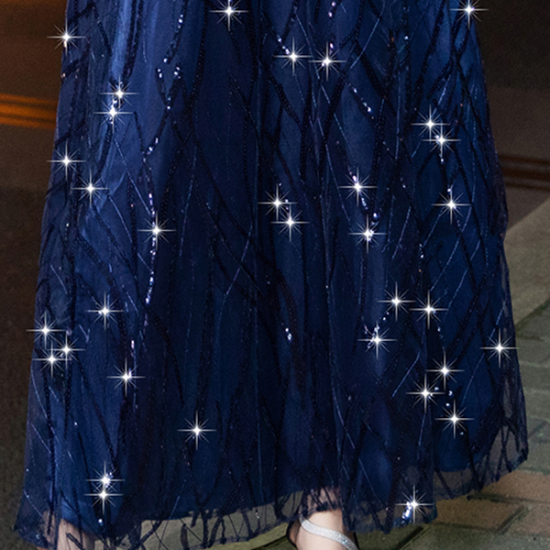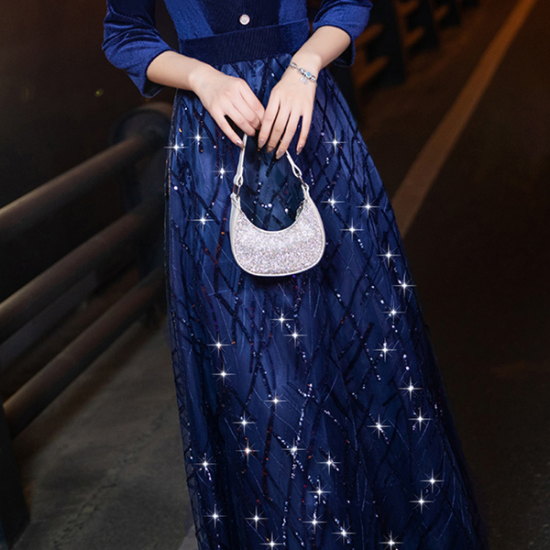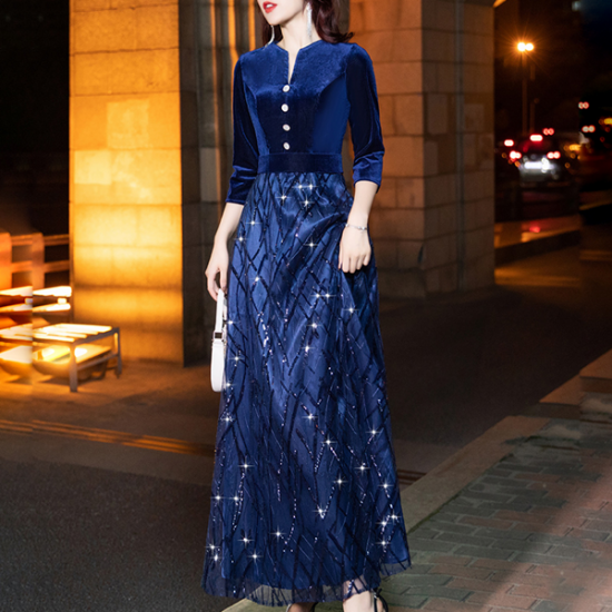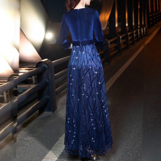 ドレス 艶 ブルー フレアロングドレス スパンコール 7分袖×キーネック エレガント 長袖×Vネック 上品フェミニン 半袖×ハートネック 結婚式 二次会 お呼ばれ