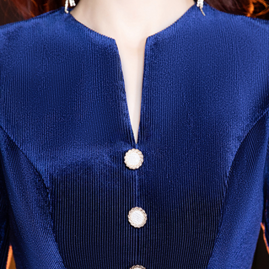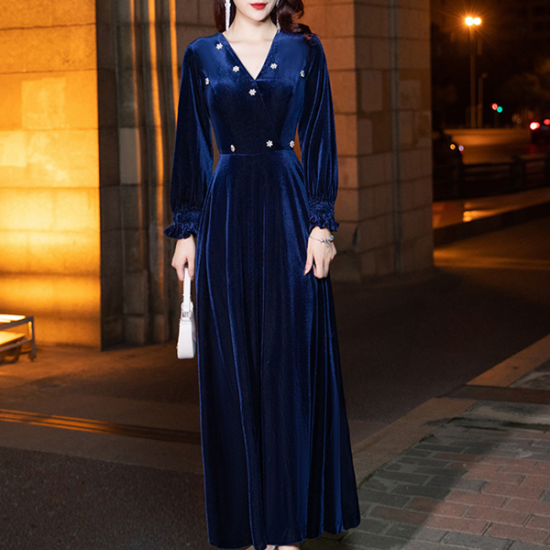 艶めくダークブルーが肌を美しく魅せる、フレアロングドレス。