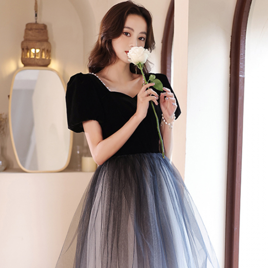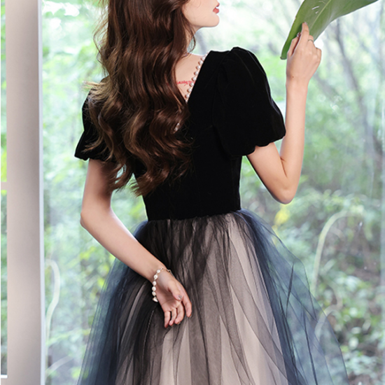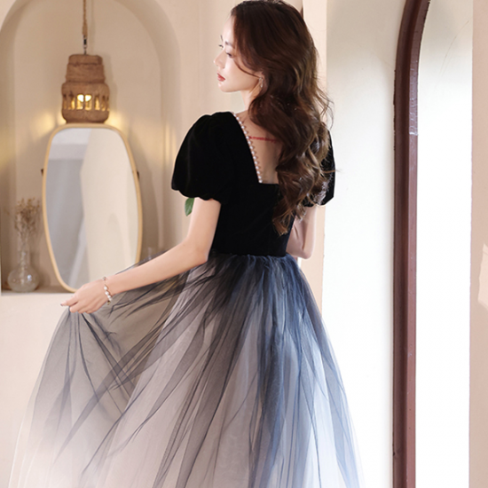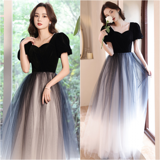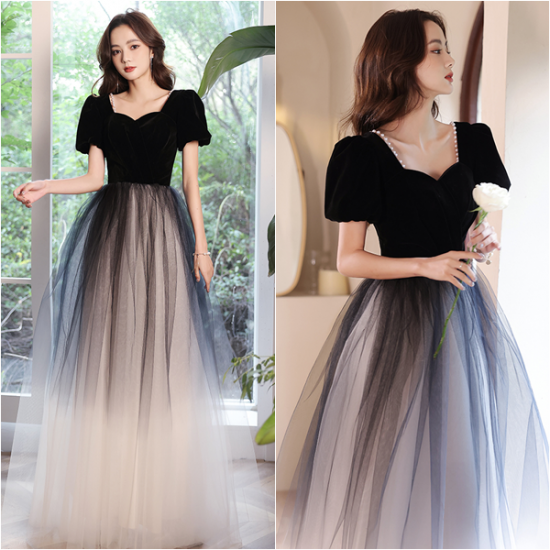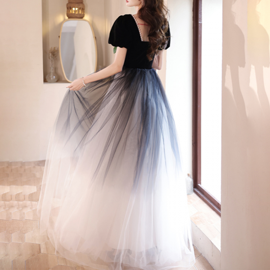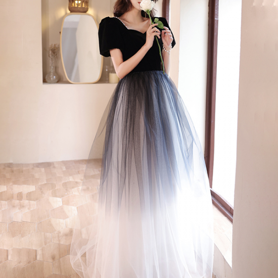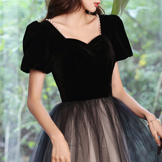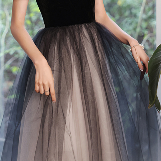 ドレス ふわ揺れ グラデーションチュール レディ モノトーン ハートネック パールストラップ アクセいらず 存在感 結婚式 二次会 お呼ばれ