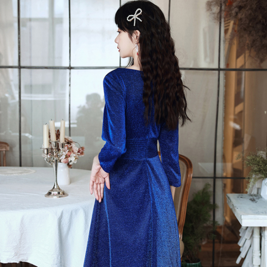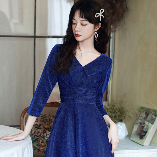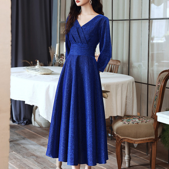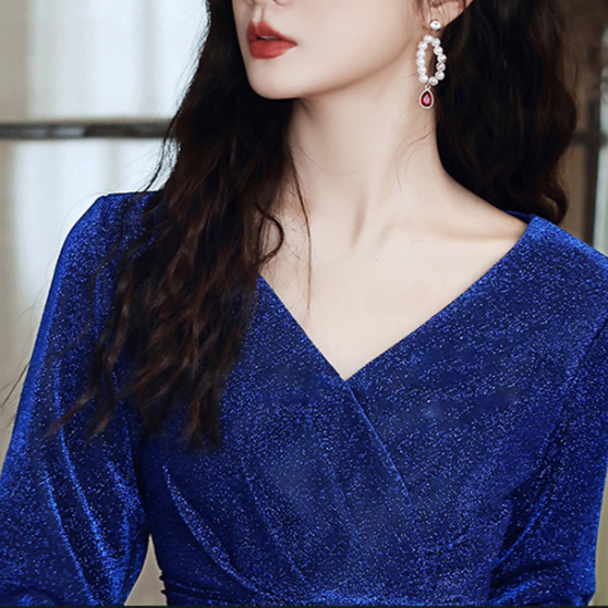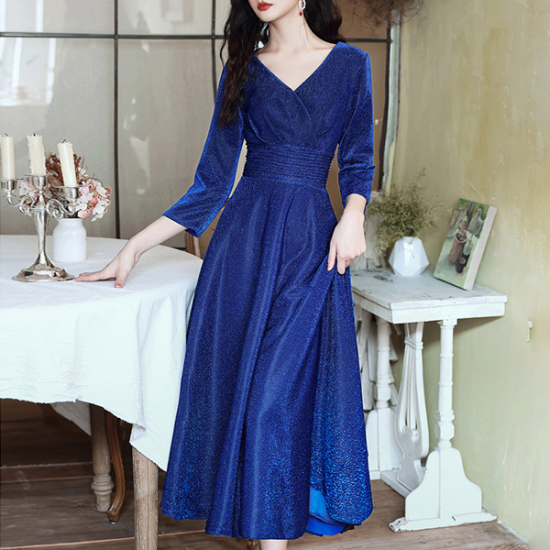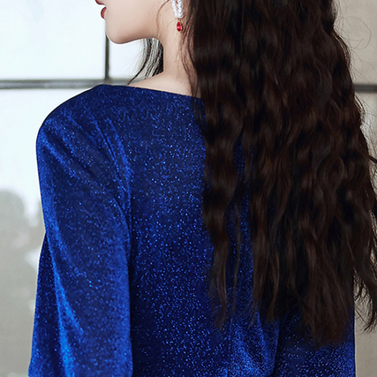 ドレス きらめき 鮮やか ブルー カシュクール 立体的 ウエストシェイプ 女性らしい シルエット ディナー コンサート 観劇 結婚式 二次会 お呼ばれ