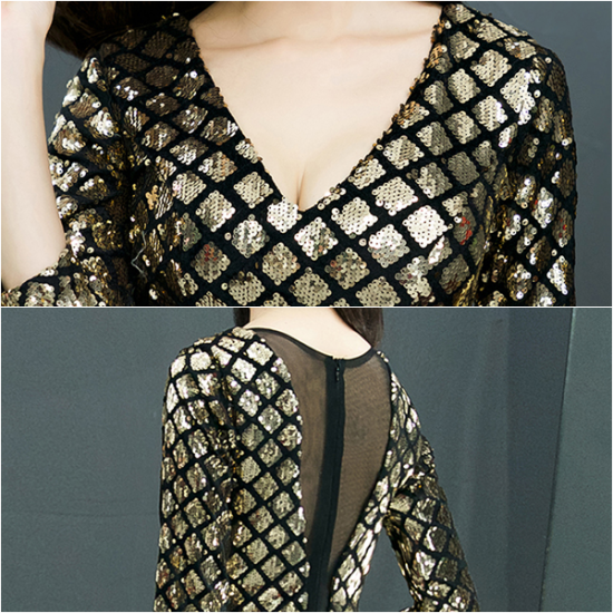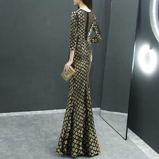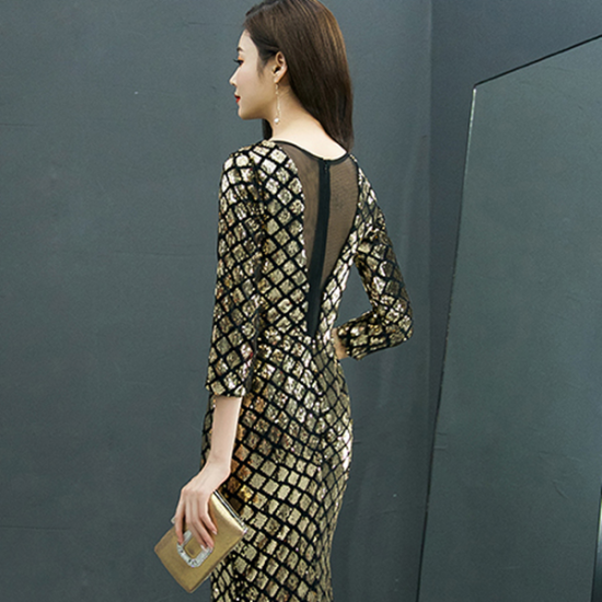ドレス 金色 スパンコール ブラック 斜めライン グラマラス マーメイドドレス バック シアー メッシュ 大人 色香 結婚式 二次会 お呼ばれ