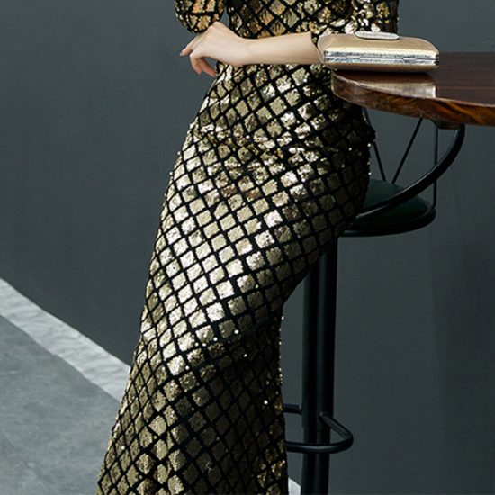 金色のスパンコールをブラックの斜めラインで引き締めた、