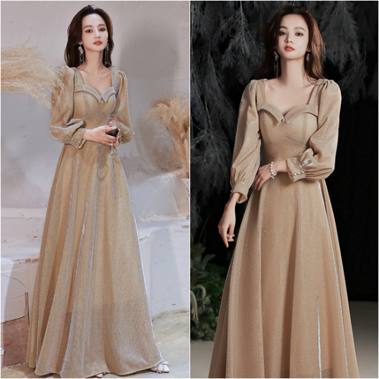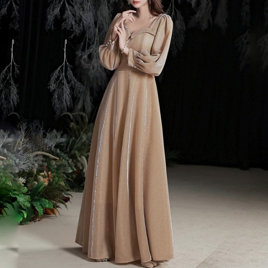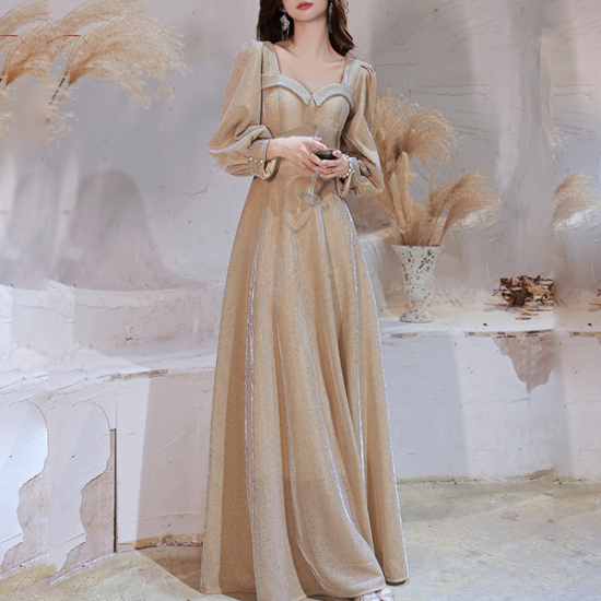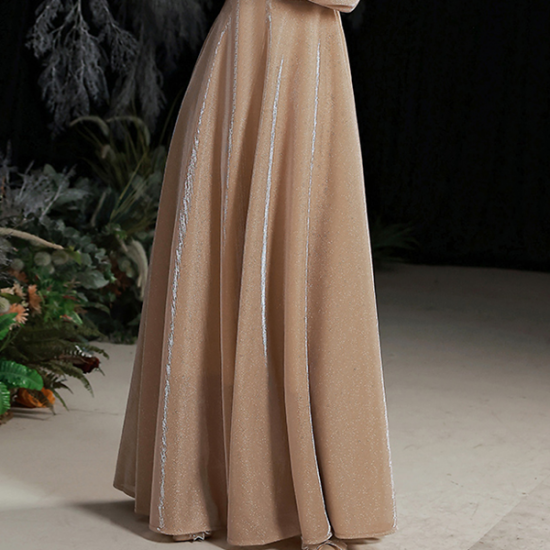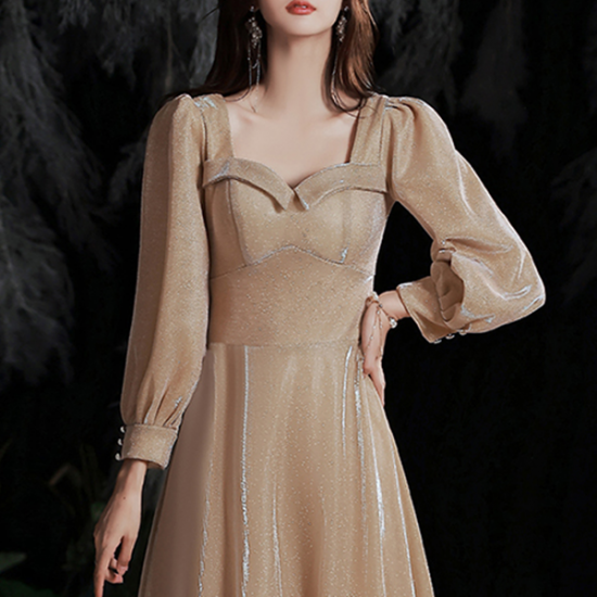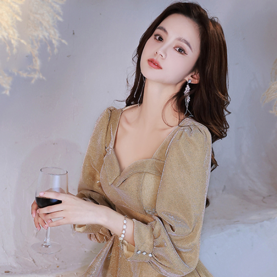 ドレス 上品 きらめき シャンパンカラー ネックライン 折り返し 端正 ウエストシェイプ 袖口ビジュー 上質 好感 結婚式 二次会 お呼ばれ