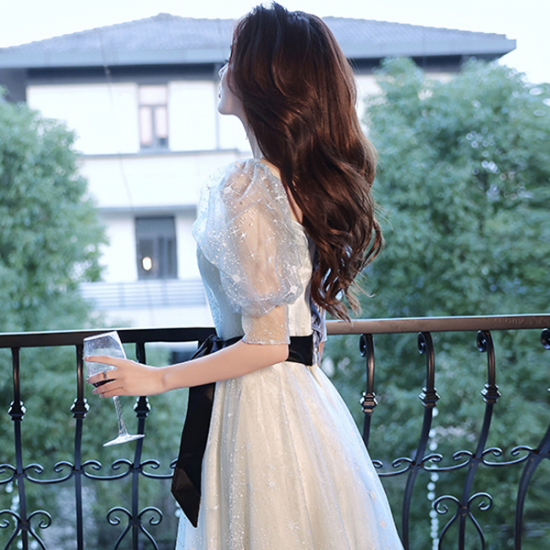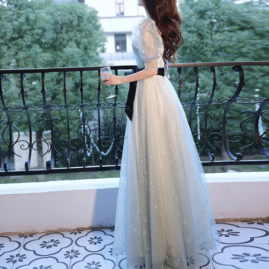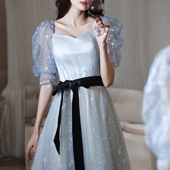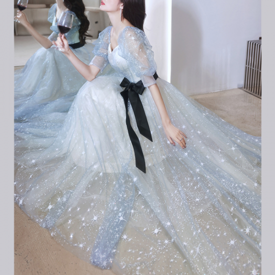 ドレス 透明感 シースルー ロング丈 サテン ウエストリボン オーガンジー 煌めき柄 オフショルダー可 可憐 結婚式 二次会 お呼ばれ