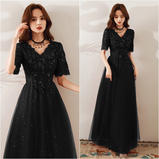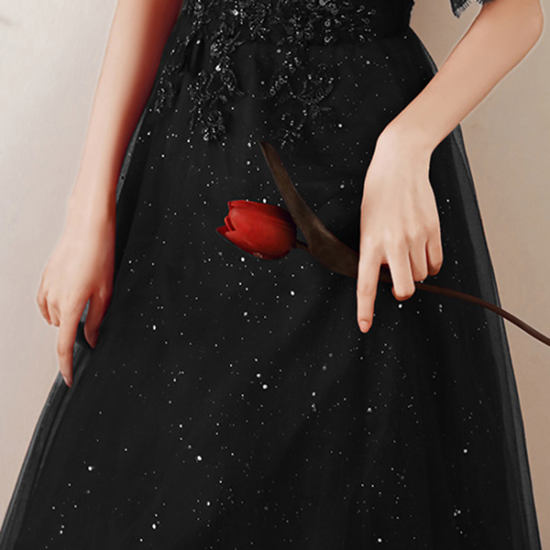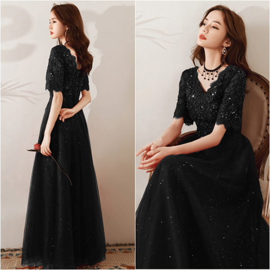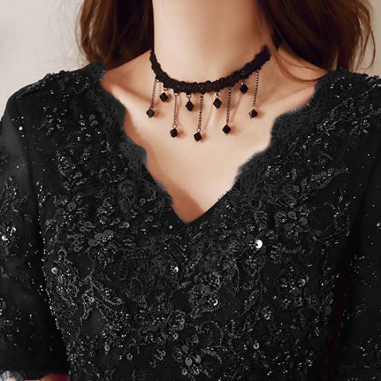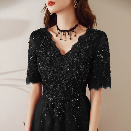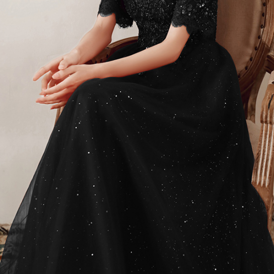 手の込んだ刺繍とスパンコール遣いで魅せるブラックドレス。