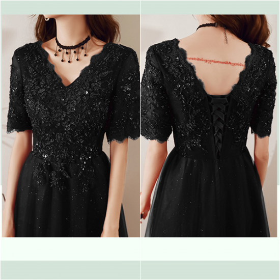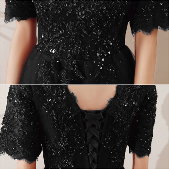 ドレス 刺繍 スパンコール ブラックドレス スカラップレース 背面レースアップ 可憐 すらり見せ スタイルアップ 結婚式 二次会 お呼ばれ