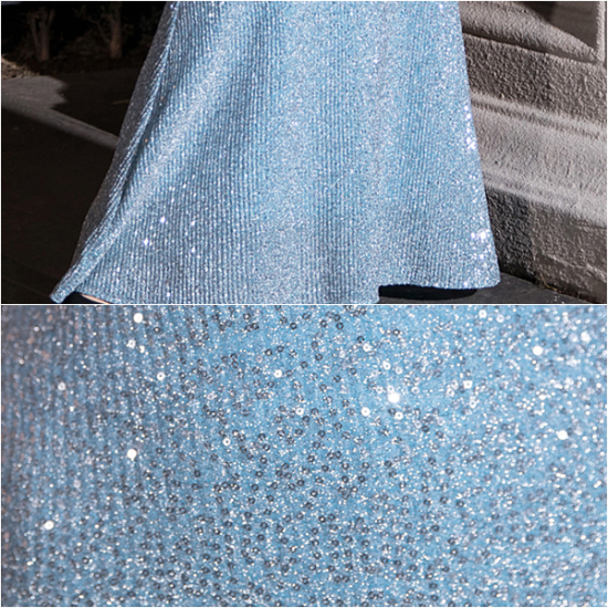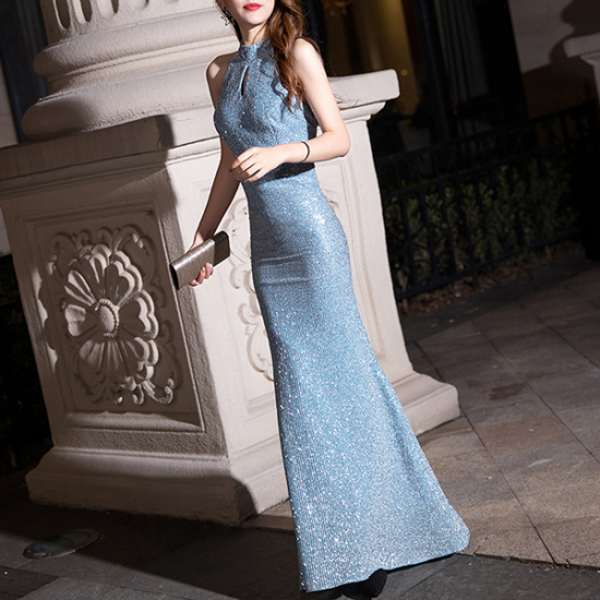 ドレス ホルターネック マーメイドライン セクシー 爽やか ライトブルー スパンコール リーフ型 涙開き アメリカンスリーブ 大人 結婚式 二次会 お呼ばれ