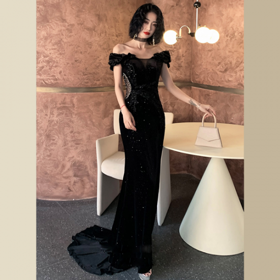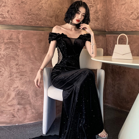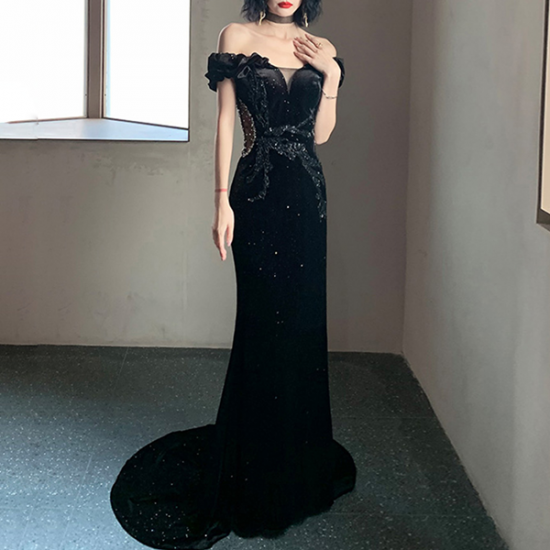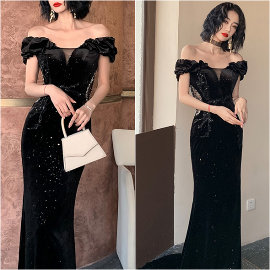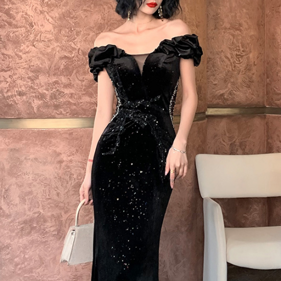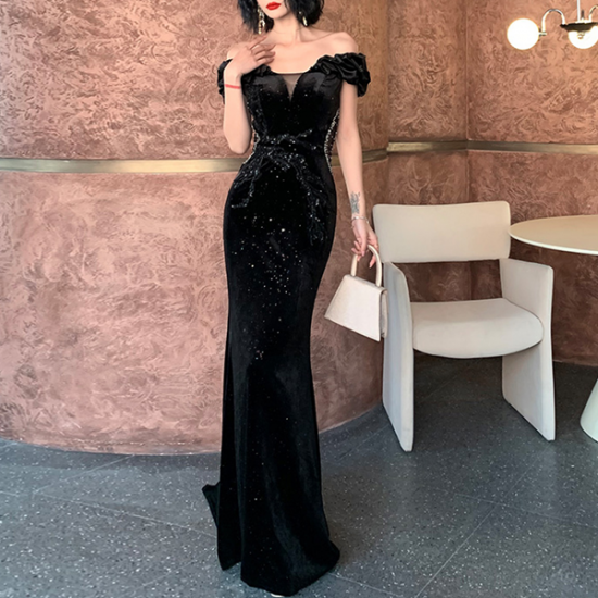 裾をたなびかせてエレガントに着こなす、オフショルダーイブニングドレス。