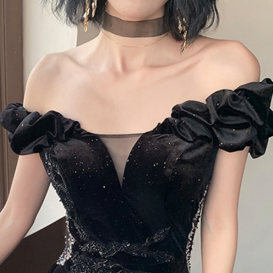 ドレス エレガント オフショルダー イブニングドレス V字メッシュ セクシー 煌めき 艶感 気品 ドレッシー 結婚式 二次会 お呼ばれ
