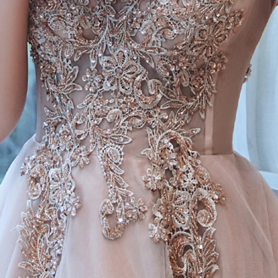 淡いピンクのオーガンジードレスに精巧なボタニカル刺繍をオン。