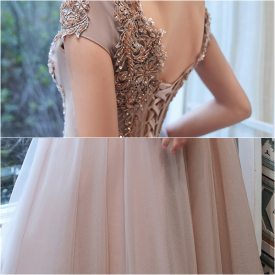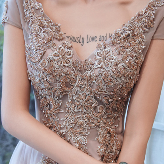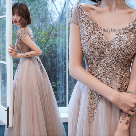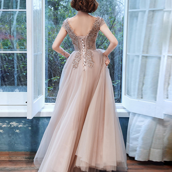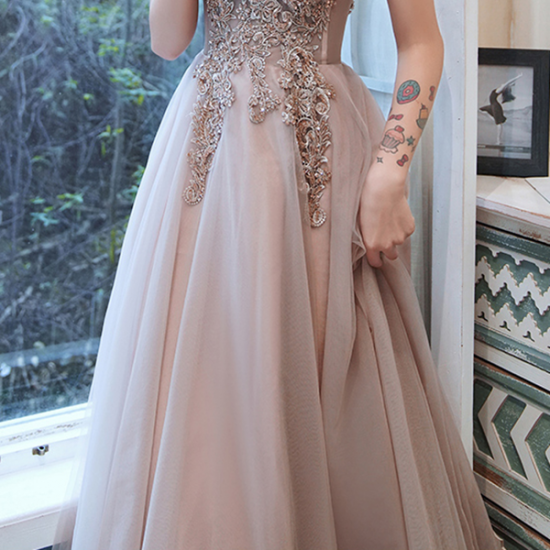 ドレス 淡ピンク オーガンジー 精巧 ボタニカル刺繍 女性らしい Vネック 背面レースアップ 小技 ロングフレア ロマンティック 結婚式 二次会 お呼ばれ