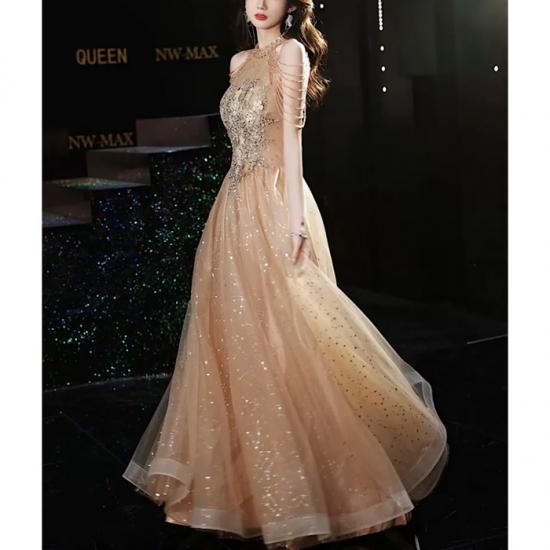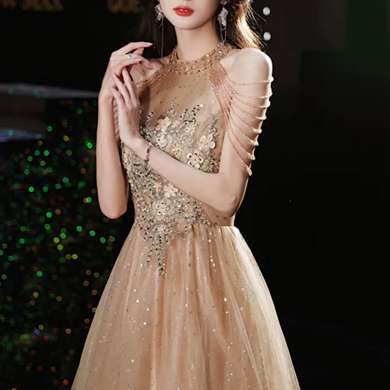 きらめくビーズタッセルが首から肩のラインを飾り、光を浴びてキラキラと輝くゴールドのドレス。