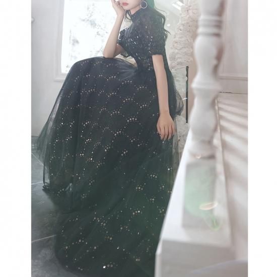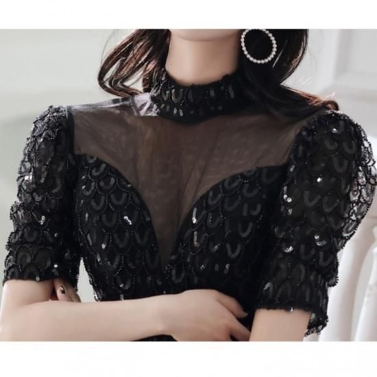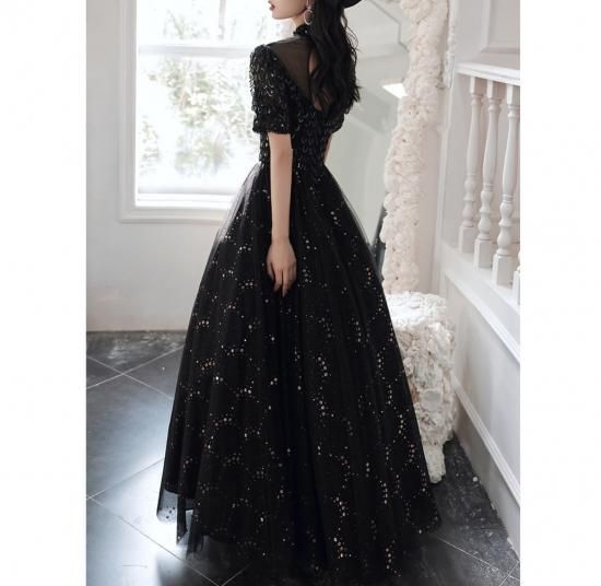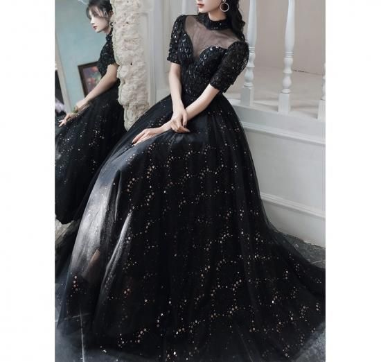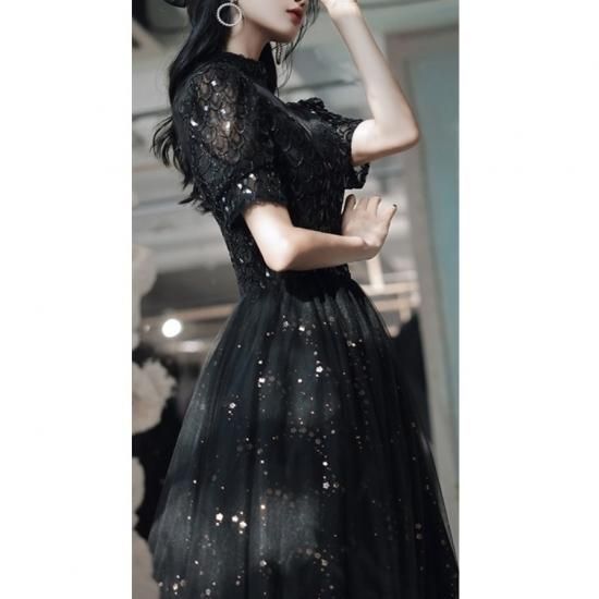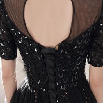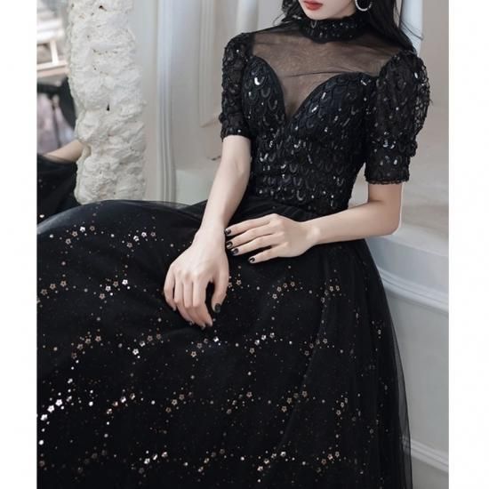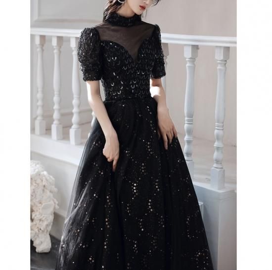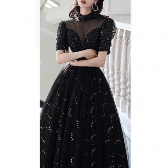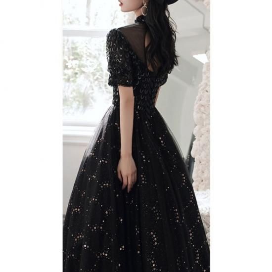ドレス ワンピース ロング丈 オーガンジー 刺繡 スパンコール 黒 ブラック ウエスト切り替え 透け感 半袖 ハイネック 襟 抜け感 クラシカル 編み上げ 背中 結婚式 二次会 お呼ばれ