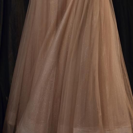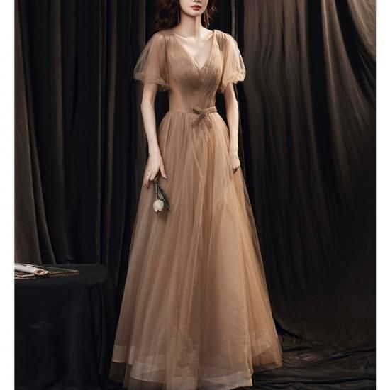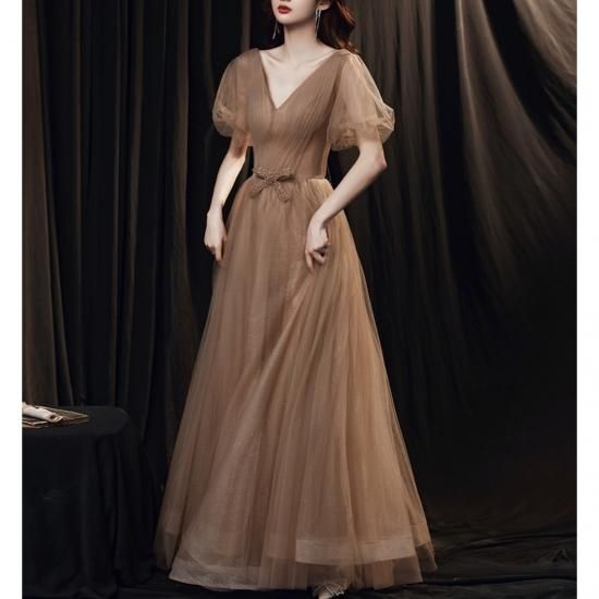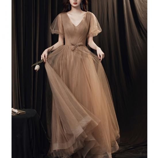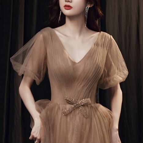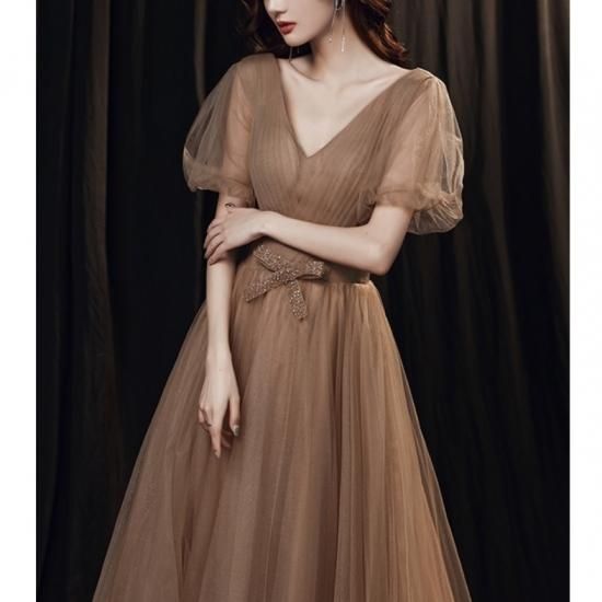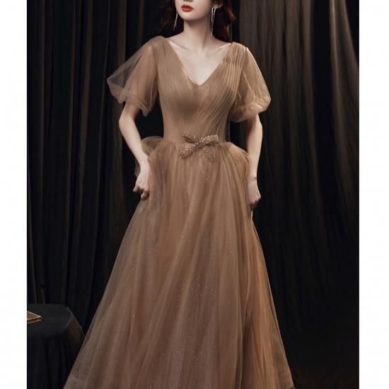 ドレス ワンピース ロング丈 Vネック 深め 透け感 オーガンジー シースルー 抜け感 ベージュ ブラウン 薄茶 半袖 リボン 甘め 結婚式 二次会 お呼ばれ