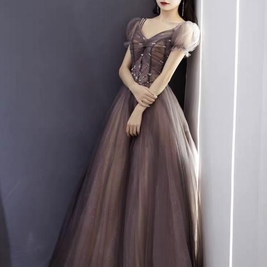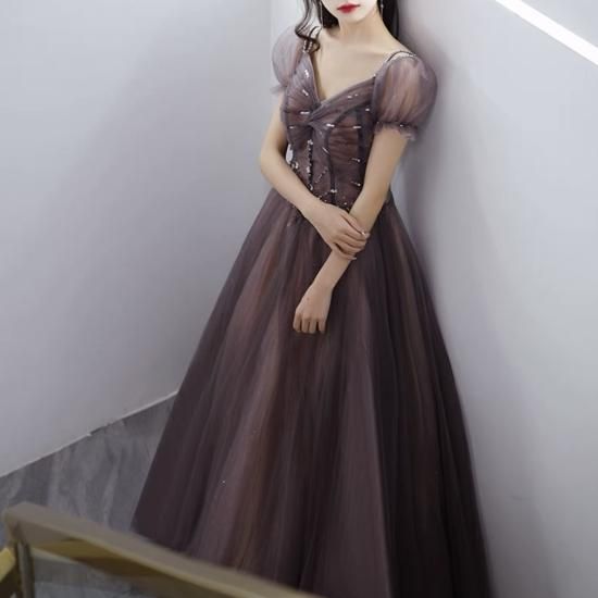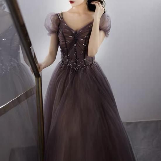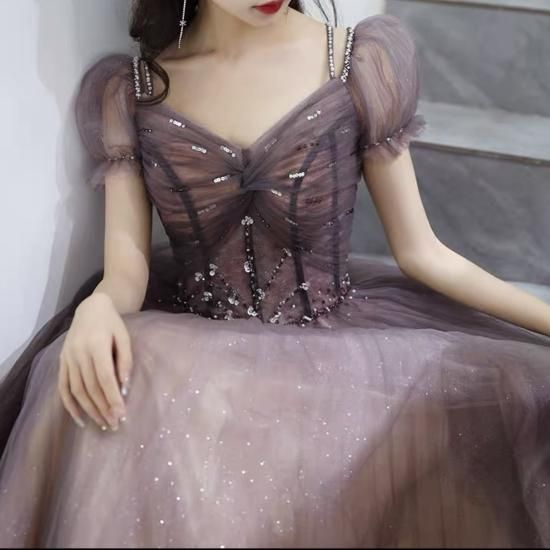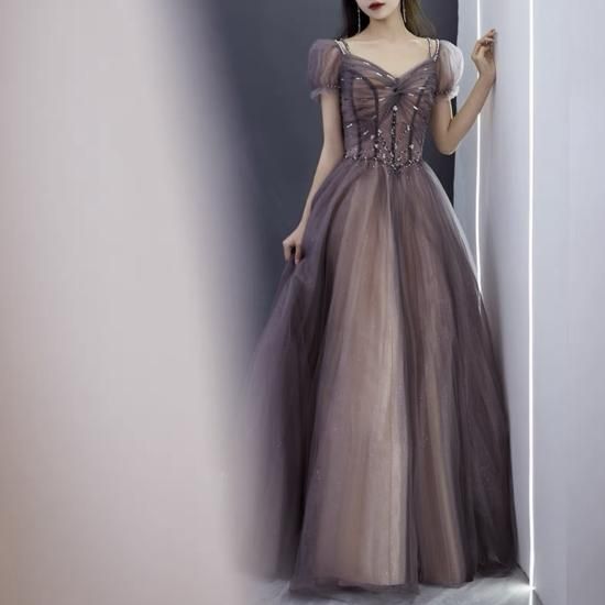 カラードレス ロング ペンタゴンネック パフスリーブ Aライン ビジュー スパンコール エレガント 上品 高貴 結婚式 二次会 パープル