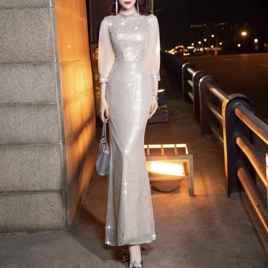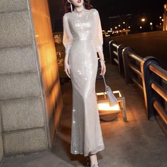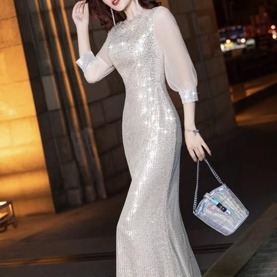 ドレス ビジュー 煌き マーメイド 美シルエット ボートネック パフスリーブ シアースリーブ 七分袖 ハイウエスト ロング丈 エレガント 華やか ゴージャス お呼ばれ 結婚式 二次会 アイボリー