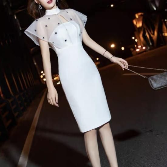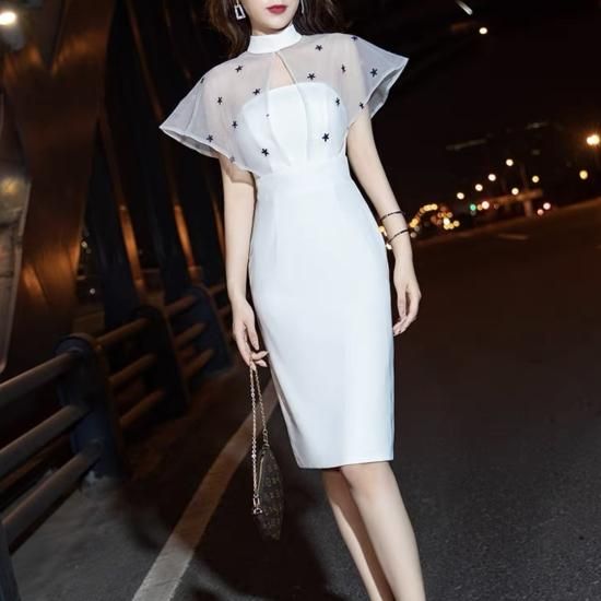 ワンピース ドレス ハイネック ビックショルダー 透け感 半袖 ハイウエスト スリム 膝丈 光沢感 エレガント シンプル モダン お呼ばれ 結婚式二次会 謝恩会 懇談会