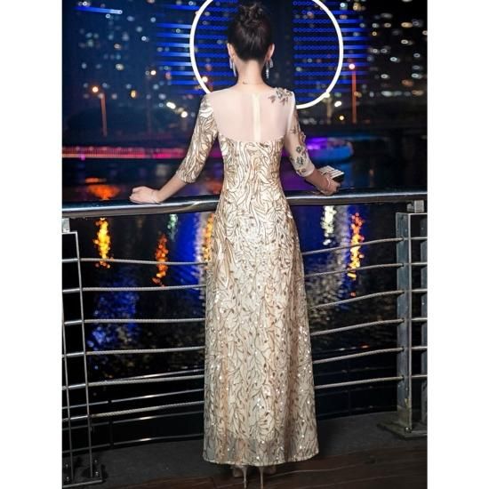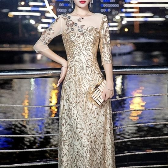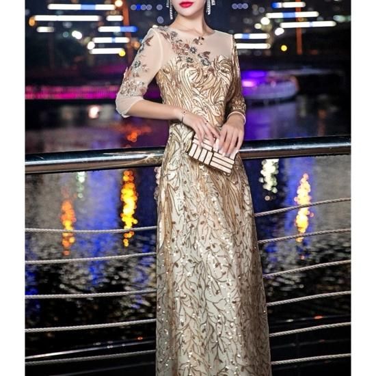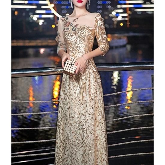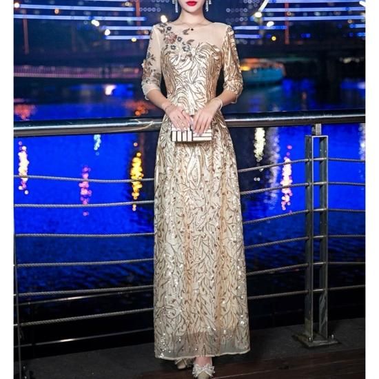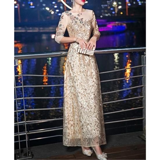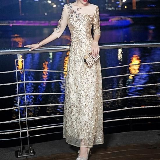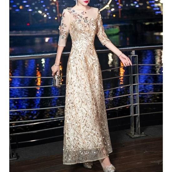ロングドレス ボタニカル刺繍 ビジュー ビーズ刺繍 七分袖 Aライン ハイウエスト エレガント ゴージャス 華やか 結婚式 結婚式二次会 お呼ばれ 演奏会