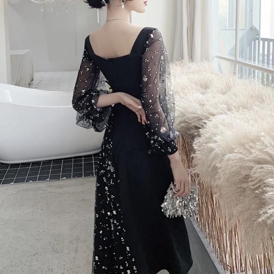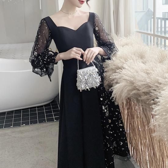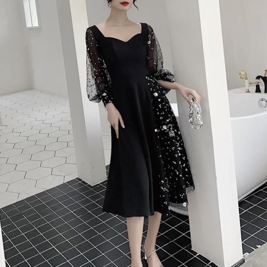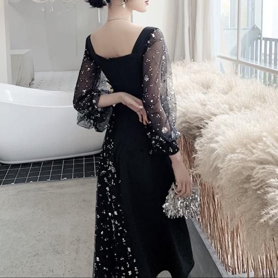 ワンピース ミディアムドレス ビジュー 煌き ペンタゴンネック ボリュームスリーブ シアースリーブ ハイウエスト Aライン ミモレ丈 エレガント シック ゴージャス お呼ばれ 結婚式 結婚式二次会
