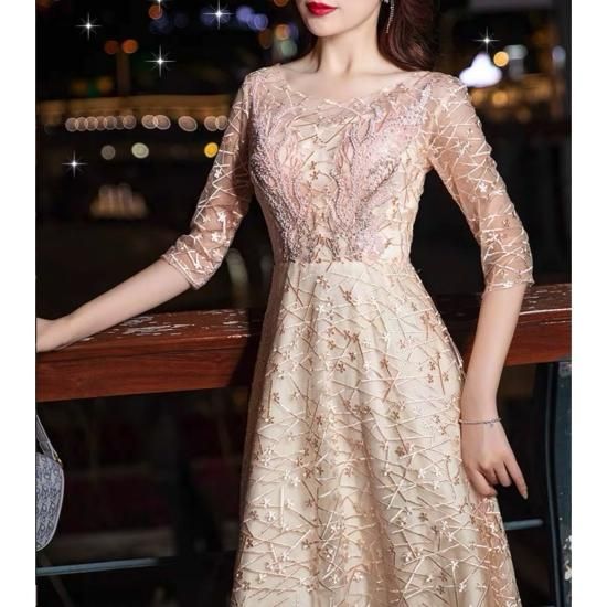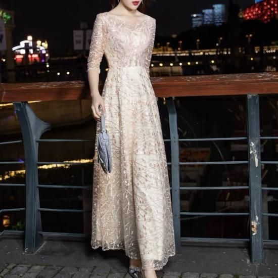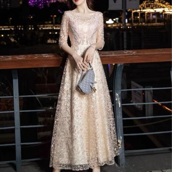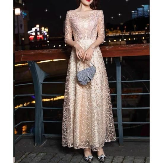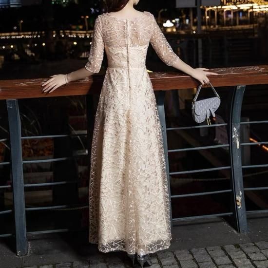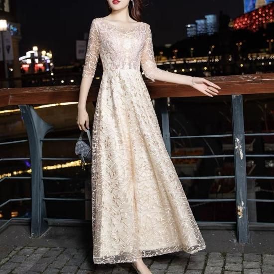 ロングドレス ボタニカル 刺繍 バトーネック Aライン 五分袖 ハイウエスト 光沢 エレガント 上品 お呼ばれ 結婚式 結婚式二次会 ベージュ系