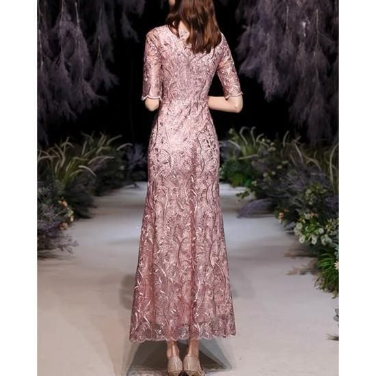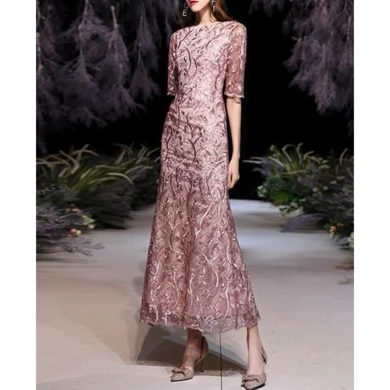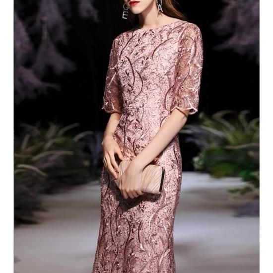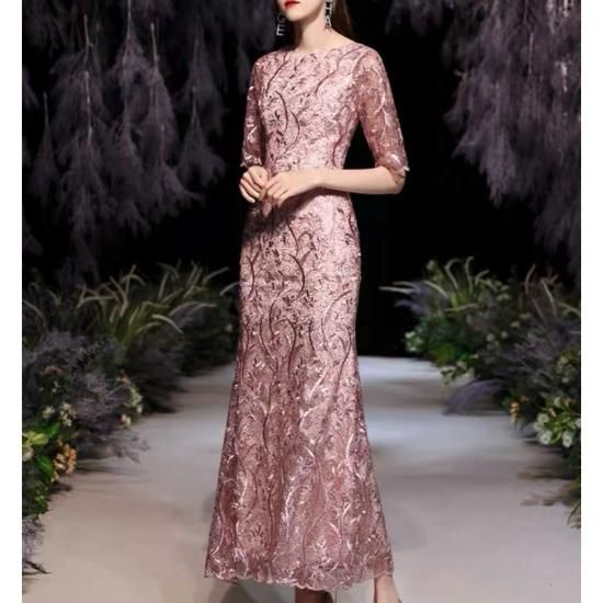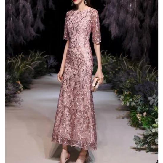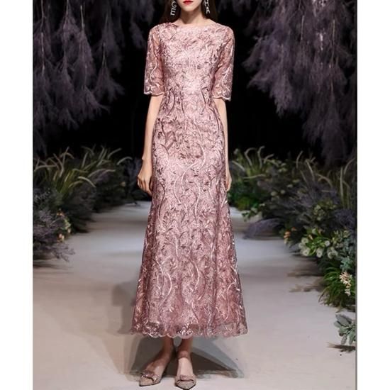ロングドレス ビジュー ボタニカル刺繍 光沢 五分袖 ハイウエスト Aライン エレガント 上品 華やか お呼ばれ 結婚式 結婚式二次会 ピンク系