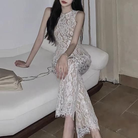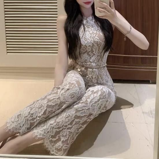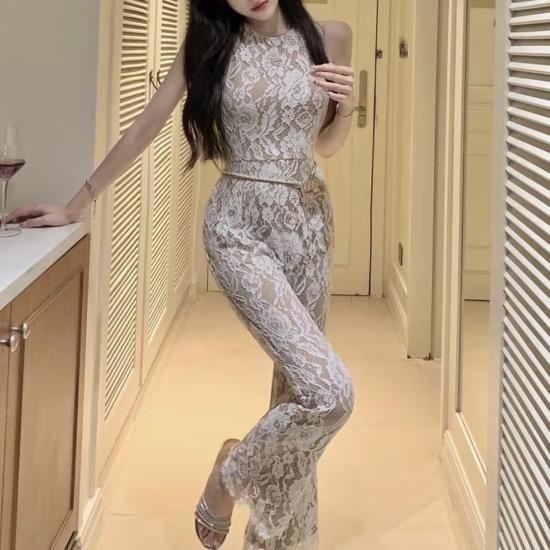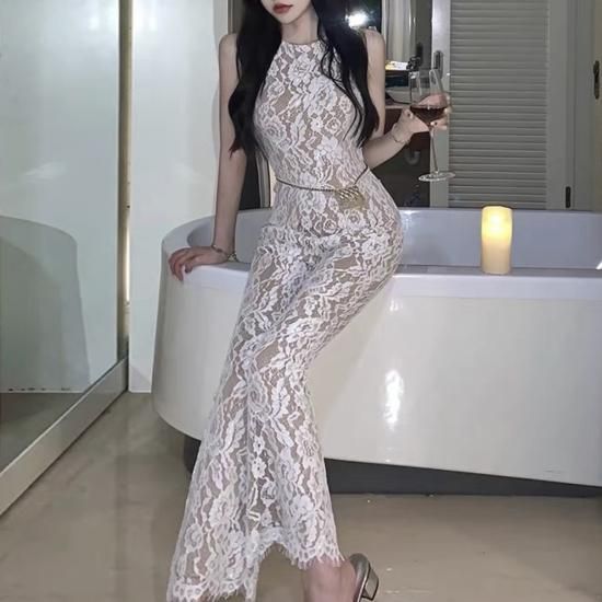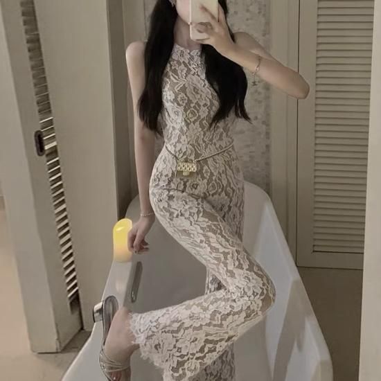 パンツドレス オールインワン 総レース ノースリーブ ラウンドネック ハイウエスト クラシカル エレガント お呼ばれ 結婚式 結婚式二次会 セレモニー ホワイト系