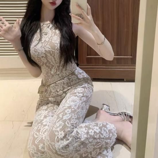 クラシカルな雰囲気を演出する総レースのパンツスーツ。