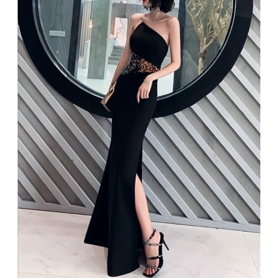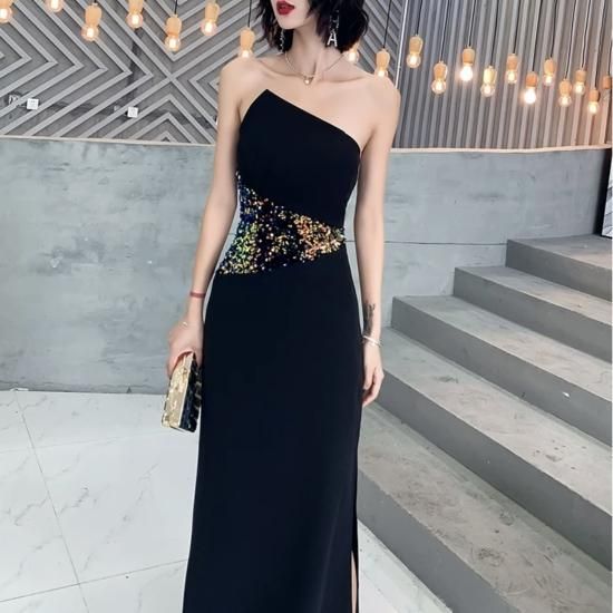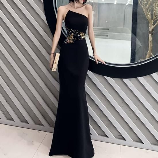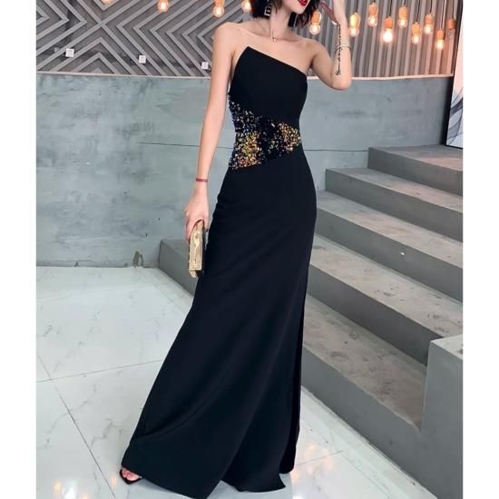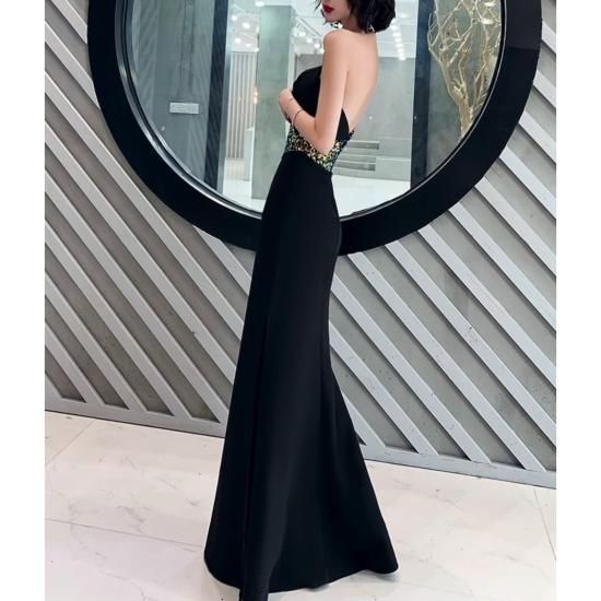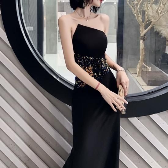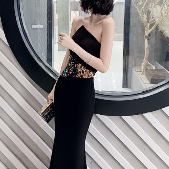 ドレス ベアトップ バックオープン マーメイド 美シルエット モダン シック エレガント セクシー 色気 スパンコール刺繍 ビジュー スリット入り お呼ばれ 結婚式 結婚式二次会 ブラック系
