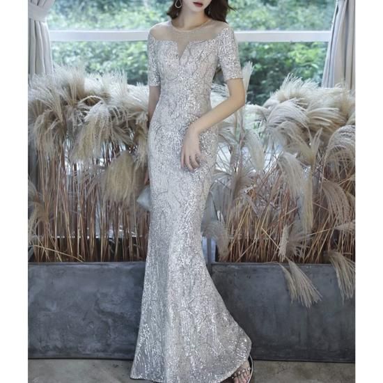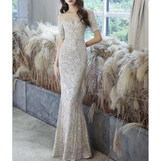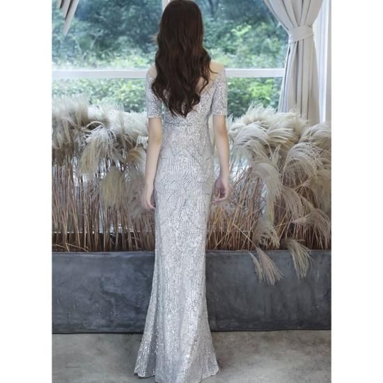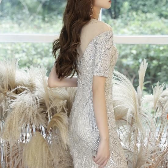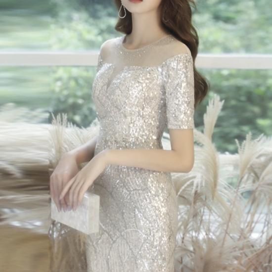 ロングドレス イブニングドレス ラウンドネック オフショルダー マーメイド 美シルエット 煌き 光沢 ビジュー ゴージャス エレガント 華やか お呼ばれ 結婚式 演奏会 シルバー系