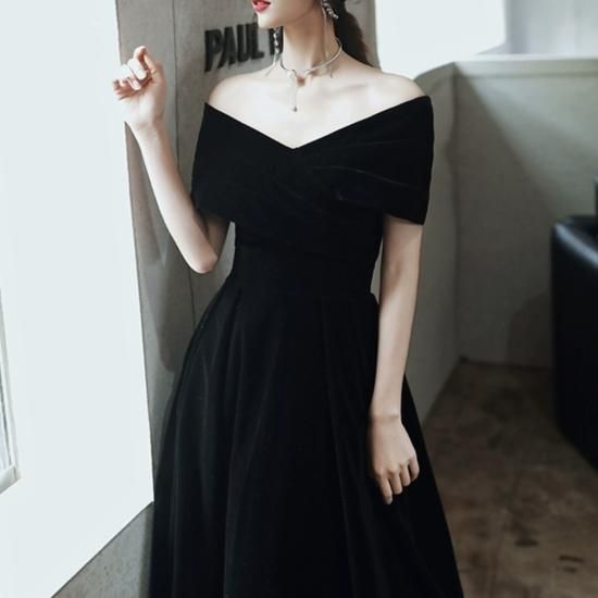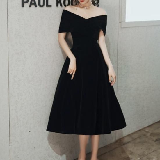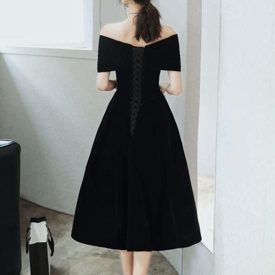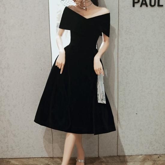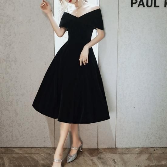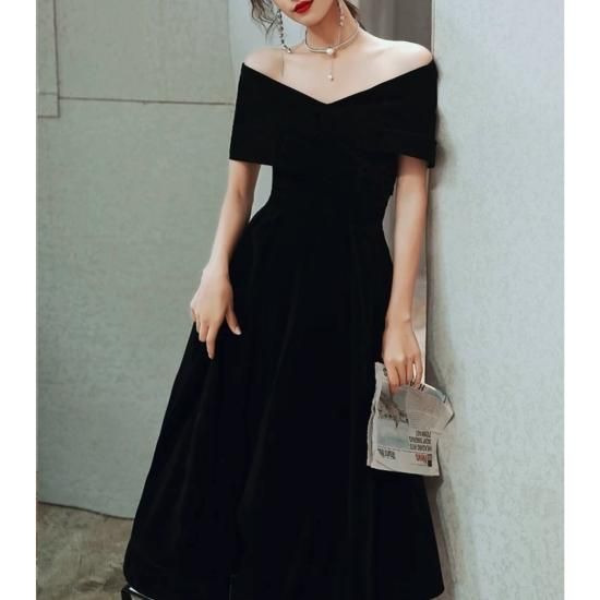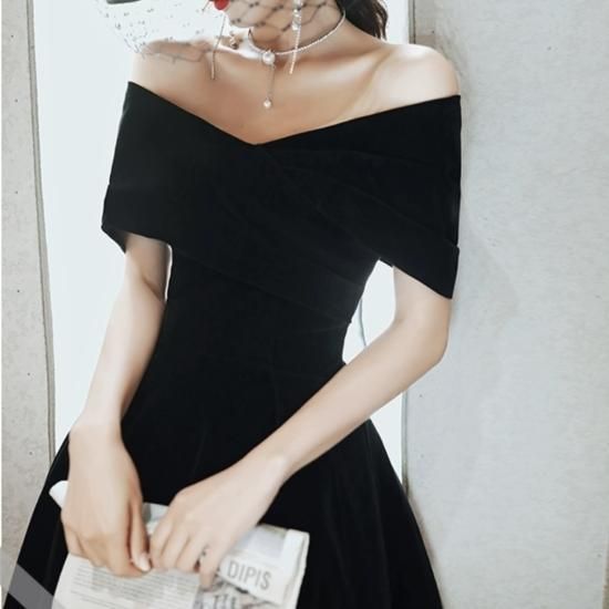 ドレス オフショルダー Vネック 袖あり ハイウエスト ミモレ丈 Aライン シック シンプル モダン エレガント お呼ばれ 結婚式 結婚式二次会 ブラック系