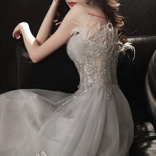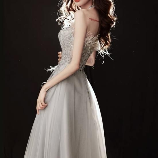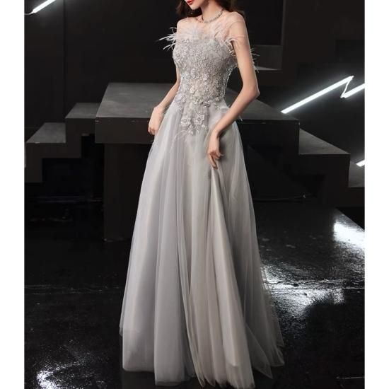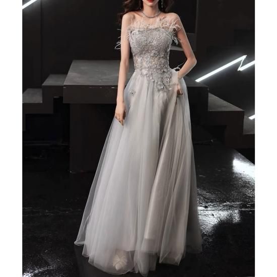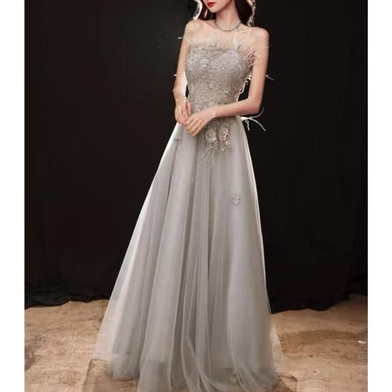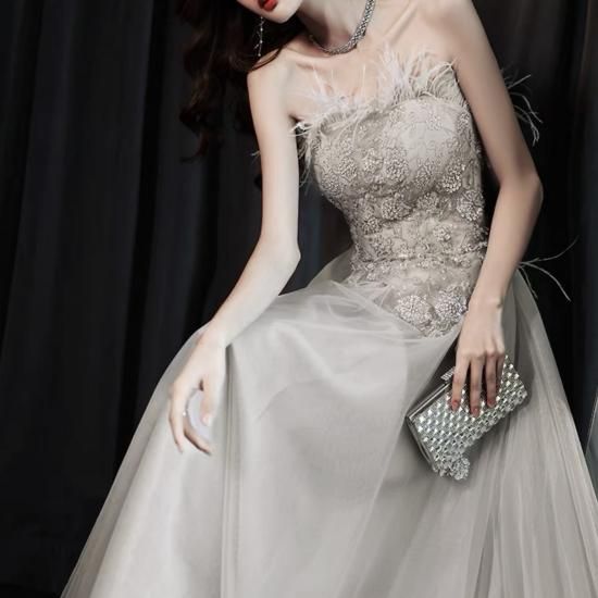 ロングドレス カラードレス グレー系 煌き チュール ビジュー フラワー刺繍 ベアトップ Aライン エレガント 上品 ゴージャス 結婚式 結婚式二次会