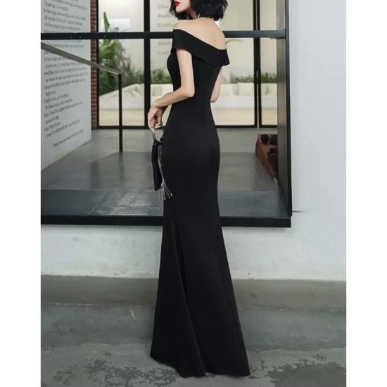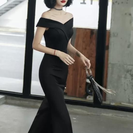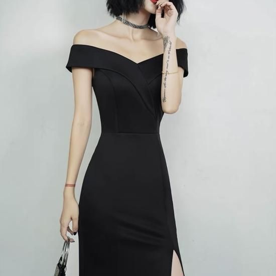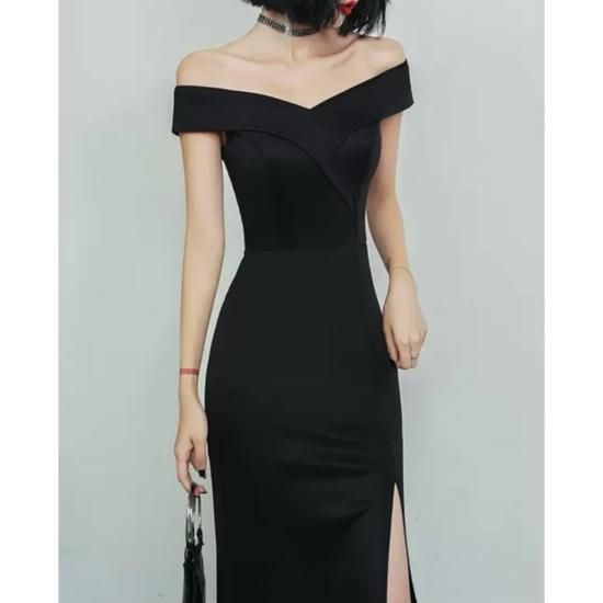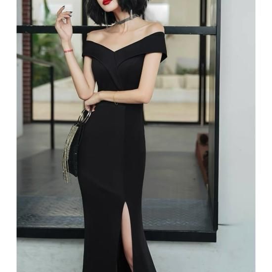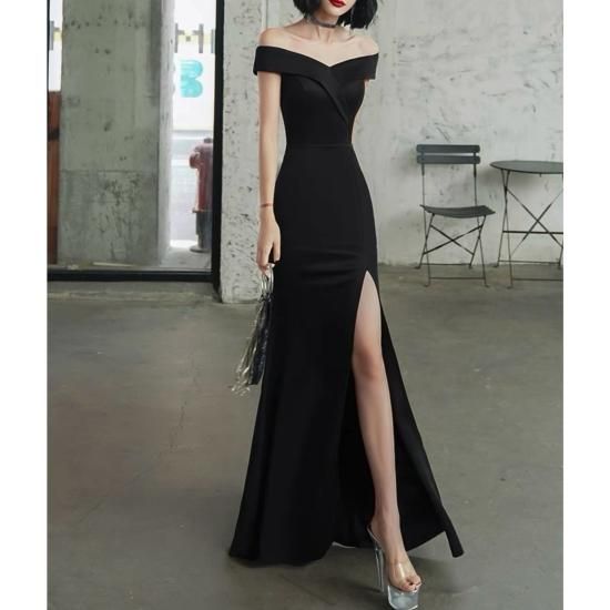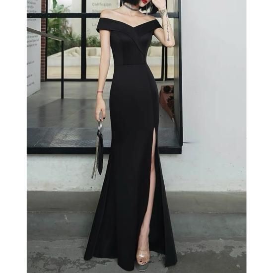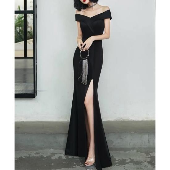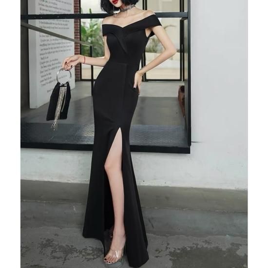 ドレス ロング丈 マーメイド 美シルエット ハイウエスト 艶感 光沢 オフショルダー スリット入り エレガント クール セクシー 大人っぽい ブラック系 お呼ばれ 結婚式 結婚式二次会