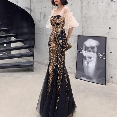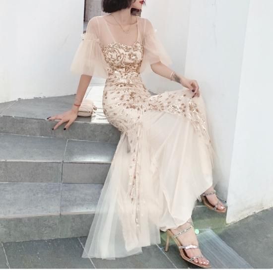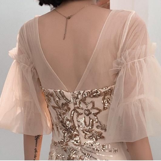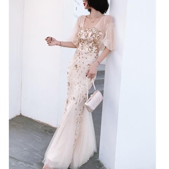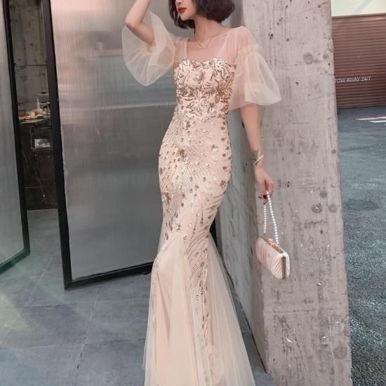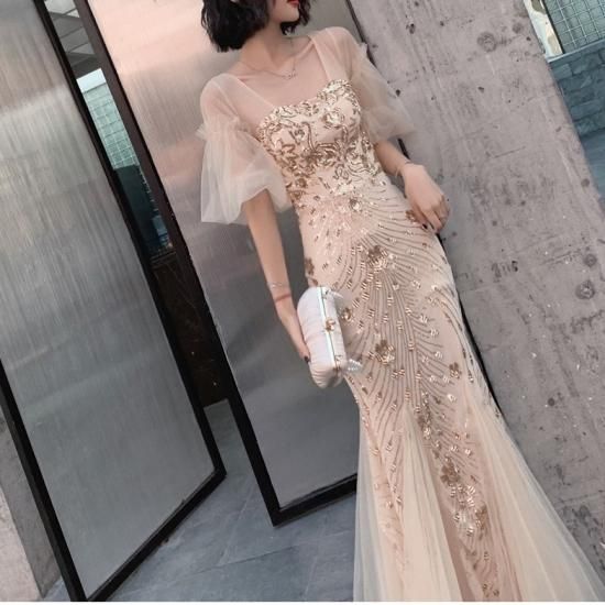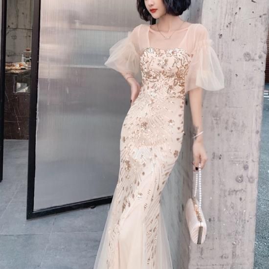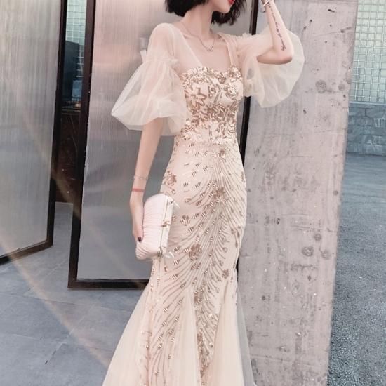 ドレス パフスリーブ オーガンジー スパンコール ビーズ 透け感 シャンパン イブニングドレス ロングドレス 結婚式 二次会 お呼ばれ