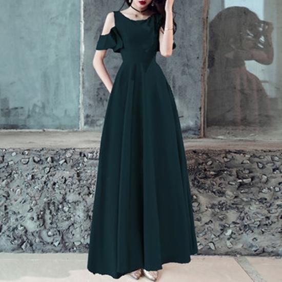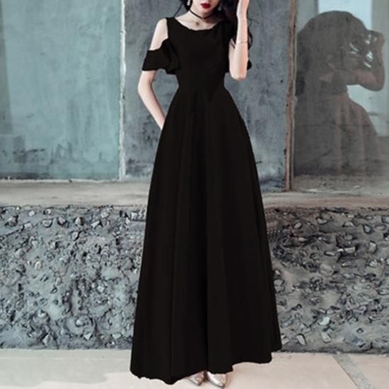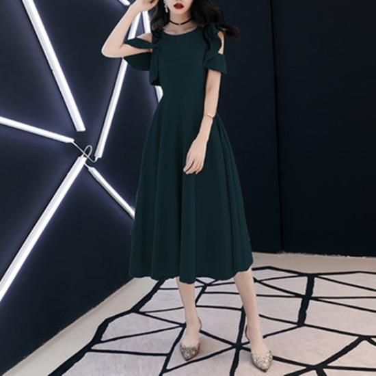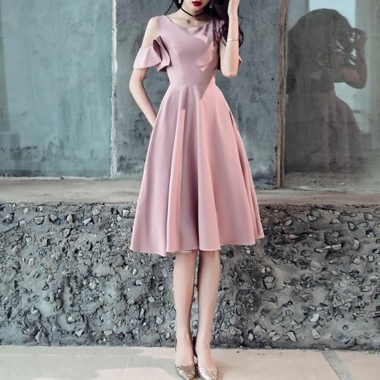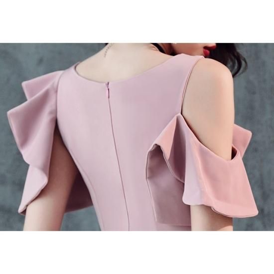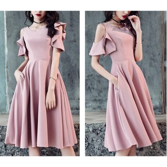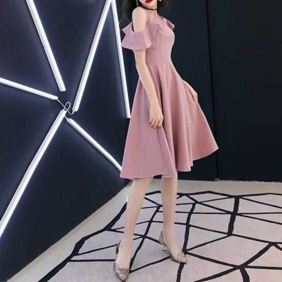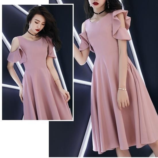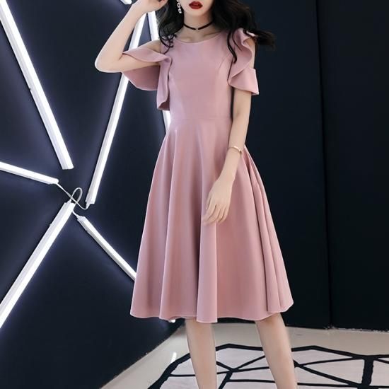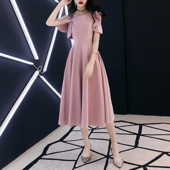 イブニングドレス ピンク フリル オープンショルダー フレアスカート 結婚式 二次会 お呼ばれ